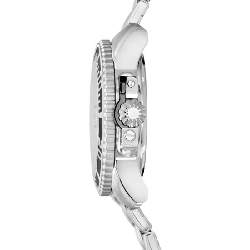 Pour cette belle montre, la marque a décidé de l'agencer avec non seulement un seul bracelet, mais avec deux bracelets modernes et tendances qui vous permettront de changer de look dans l'espace d'un instant. D'une largeur d'entrecorne de 23 mm, ils assureront un port confortable et agréable en toute occasion en enveloppant votre poignet avec finesse et souplesse. Le premier bracelet est conçu en acier inoxydable avec une finition polie et est composé de trois rangées de maillons. Celui-ci sera le choix idéal pour arborer une allure sport chic soignée. Vous pourrez le sécuriser sur votre poignet à l'aide de sa boucle déployante avec boutons poussoirs. Fabriqué en caoutchouc, le deuxième bracelet de couleur noire saura se marier avec toutes vos tenues en leur accordant une touche de sobriété intemporelle. Pour le fermer et le retirer, vous disposerez d'une boucle ardillon en acier inoxydable qui assurera son bon maintient.