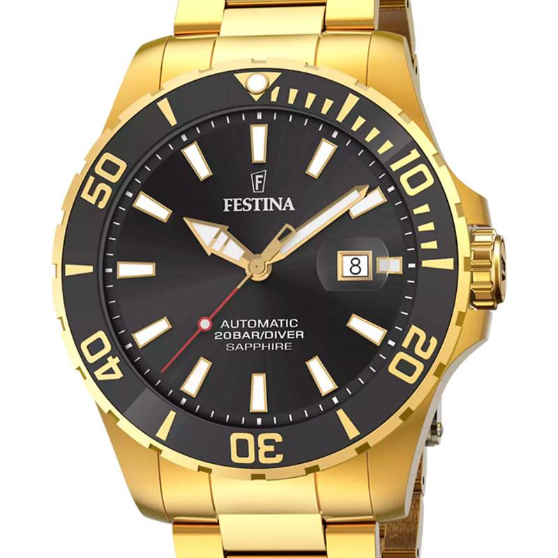 Festina présente un nouveau modèle de sa collection Diver Automatique aux couleurs noires et dorées. Ce garde-temps saura convenir aux hommes déterminés et assurés à la recherche d'un compagnon de poignet à porter au quotidien. En effet, son boîtier de 44 millimètres de diamètre et de 13 millimètres d'épaisseur est parfait à enfiler tous les jours. Conçu en acier inoxydable au traitement PVD doré, il saura charmer quiconque regardera votre poignet. Une lunette plongeuse graduée entoure le cadran. Ce dernier est d'ailleurs protégé de toutes rayures grâce à son verre saphir. La couronne remontoir est située à trois heures. Enfin, le fond vissé assure une étanchéité de 20 atmosphères.