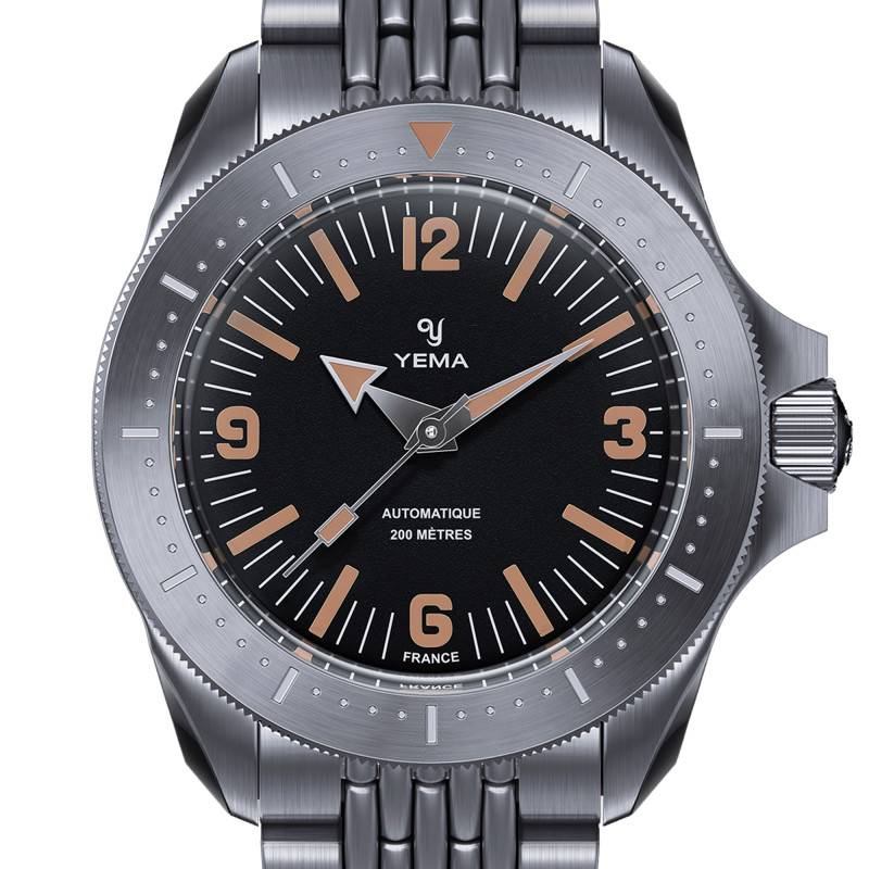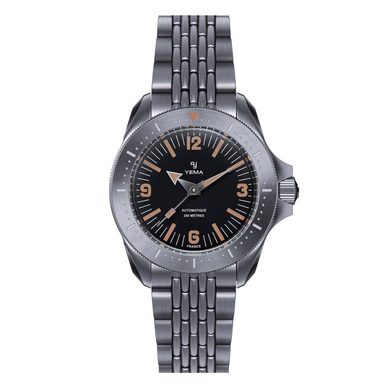 Ce cadran mat présente un fond de couleur noire, une teinte parfaite pour une lecture fluide des indicateurs. Légèrement sablé, il est survolé par deux aiguilles "Broad Arrow" qui indiquent les heures et les minutes et par une fine trotteuse paddle dédiée aux secondes. De couleur grise, celles-ci sont munies d'un revêtement luminescent beige qui facilite la lecture temporelle dans les endroits sombres. Ce traitement est appliqué également sur les index rectangulaires et les chiffres arabes qu'elles survolent. Le pourtour de ce cadran est longé par un chemin de fer des minutes gradué en blanc. Pour conclure, le nom de la marque Yema est mentionné vers 12 heures en guise de signature.