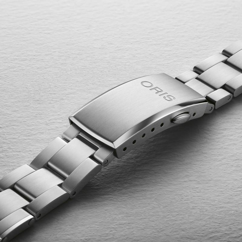 Le premier bracelet est un modèle Oris au design riveté qui est formé par trois rangées de maillons. Sa couleur argentée due à sa conception en acier inoxydable est mise en valeur par une finition brossée/polie qui créera un joli effet visuel sur votre poignet. Ce bracelet s'accorde avec toutes les tenues et s'avère être confortable et facile à inter-changer. Il est équipé d'une boucle déployante avec boutons poussoirs qui porte le nom de la marque. Celle-ci vous aidera à le manier aisément en le maintenant sécurisé.