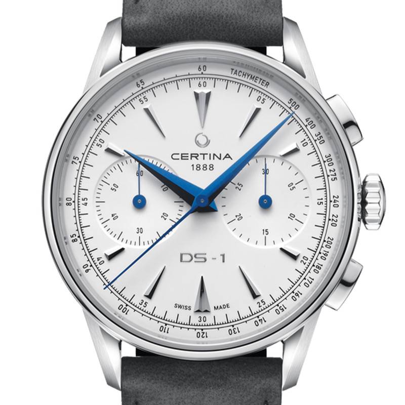 Le cadran de la Certina DS-1 Chrono Auto se distingue par son élégance et sa fonctionnalité. Arborant une couleur blanche raffinée, il est savamment accentué par des touches de bleu sur les aiguilles et les index. Les aiguilles de style glaive sont luminescentes, assurant une lisibilité optimale dans toutes les conditions. Doté d'index stylés et d'un chemin de fer des minutes, il allie esthétique et précision. Les deux compteurs additionnels intégrés, de 30 et 60 minutes, apportent une dimension chronométrique à ce modèle.