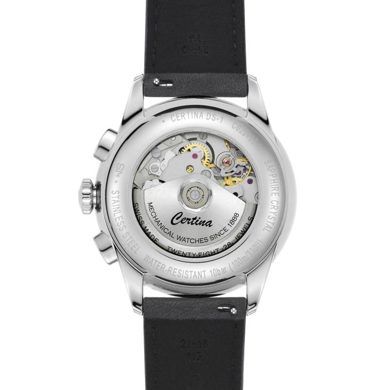 La Certina DS-1 Chrono Auto est une montre remarquable conçue pour les hommes à la recherche de qualité sans compromis et de design sophistiqué. Le boîtier rond en acier inoxydable 316L, avec ses dimensions généreuses de 42.00 mm de diamètre et une épaisseur de 14,30 mm, confère à cette montre une présence audacieuse mais élégante sur le poignet. Le verre saphir traité antireflets protège le délicat cadran en offrant une vue dégagée et une résistance exceptionnelle aux rayures. Le fond de la montre, à la fois emboité et transparent, permet d'admirer le mouvement interne, offrant une touche de technicité horlogère en parfaite harmonie avec son esthétique.