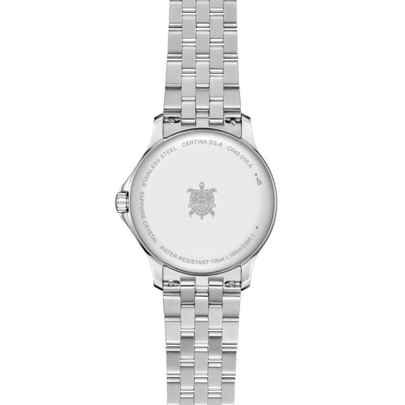 L'étanchéité de cette montre Certina DS-8 Lady est certifiée à une profondeur de 10 ATM, ce qui la rend apte à résister à la pression de l'eau jusqu'à 100 mètres de profondeur. Cette caractéristique en fait une compagne idéale pour la natation et d'autres activités aquatiques, tout en étant suffisamment résistante pour supporter la pluie ou les éclaboussures.