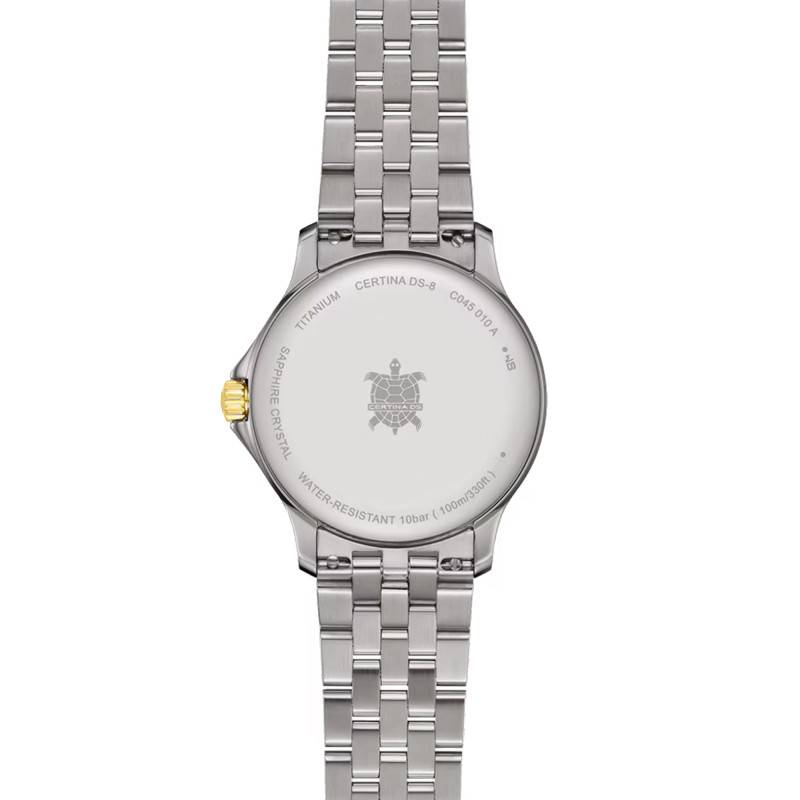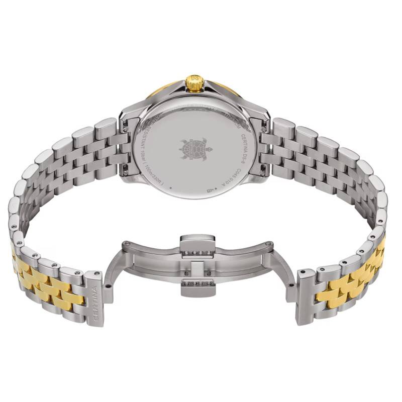 L’étanchéité de la montre Certina DS-8 Lady est garantie jusqu’à 10 ATM, ce qui en fait un garde-temps adapté à un usage quotidien varié, incluant la natation et les activités légèrement aquatiques.