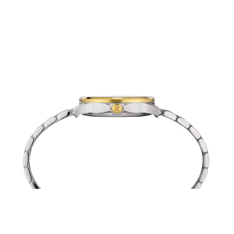 Le cadran de la Certina DS-8 Lady est un véritable hommage à la sophistication. Véritable tableau de style, il arbore une finition gris métallisé qui se marie harmonieusement avec les tons jaunes du PVD du boîtier. Doté d'un affichage analogique classique avec heures, minutes, et secondes, il est rehaussé par des index fins et un chemin de fer qui apportent une précision supplémentaire lors de la lecture. Un guichet discret situé à 6 heures présente la date, ajoutant une fonctionnalité précieuse sans rompre l'esthétisme général.