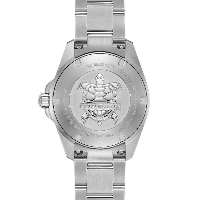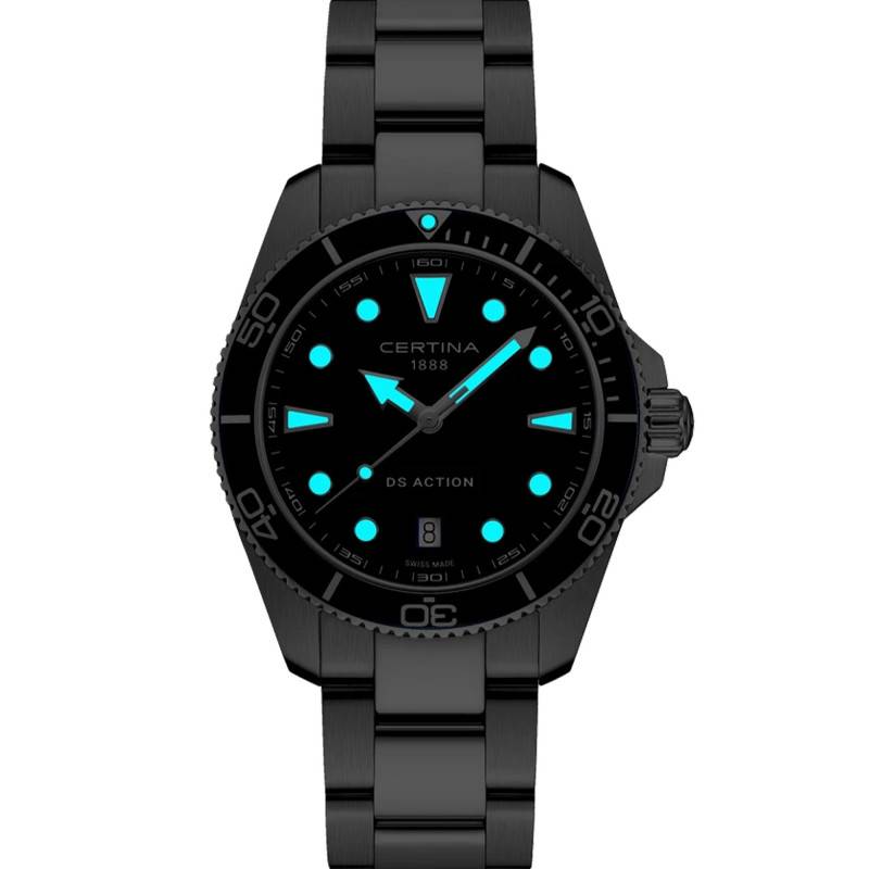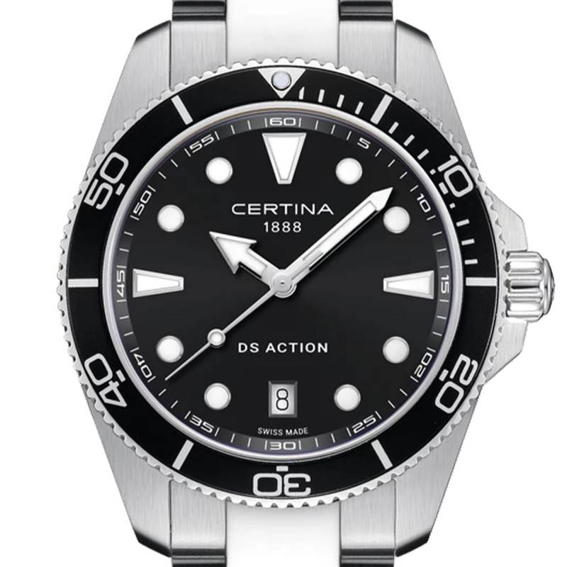 Le cadran de cette montre Certina se distingue par sa teinte noire intense, qui accueille des index distinctifs et un chemin de fer pour une lecture précise du temps. Le guichet date est subtilement intégré, ajoutant une fonctionnalité pratique sur ce cadran raffiné. Les aiguilles sont recouvertes de SuperLuminova, tout comme les index et le chemin de fer, garantissant une lisibilité optimale même dans l'obscurité la plus totale. La lunette bidirectionnelle, en aluminium, arbore des marqueurs luminescents pour assurer la précision du chronométrage, que ce soit dans le cadre d'activités quotidiennes ou sous-marine.