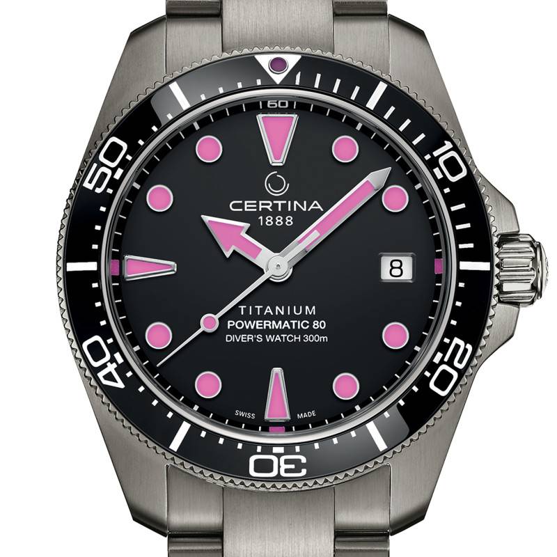 La Certina DS Action Diver 38, un modèle conçu pour ceux qui cherchent à allier style et fonctionnalité dans un garde-temps contemporain. Le boîtier rond fabriqué en titane donne à cette montre une légèreté exceptionnelle tout en maintenant une robustesse impressionnante. Avec un diamètre de 38 mm et une épaisseur de 13,20 mm, elle épouse parfaitement le poignet, rendant son port des plus agréables. Un des éléments qui accroche particulièrement et qui attire l'œil est la lunette céramique noire unidirectionnelle, embellie par des marqueurs luminescents roses, qui allie esthétique et fonctionnalité. En outre, son verre saphir est non seulement plat, mais il bénéficie aussi d'un traitement antireflets, apportant une lisibilité optimale sous tous les angles de vision.