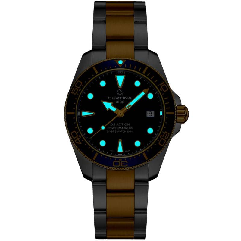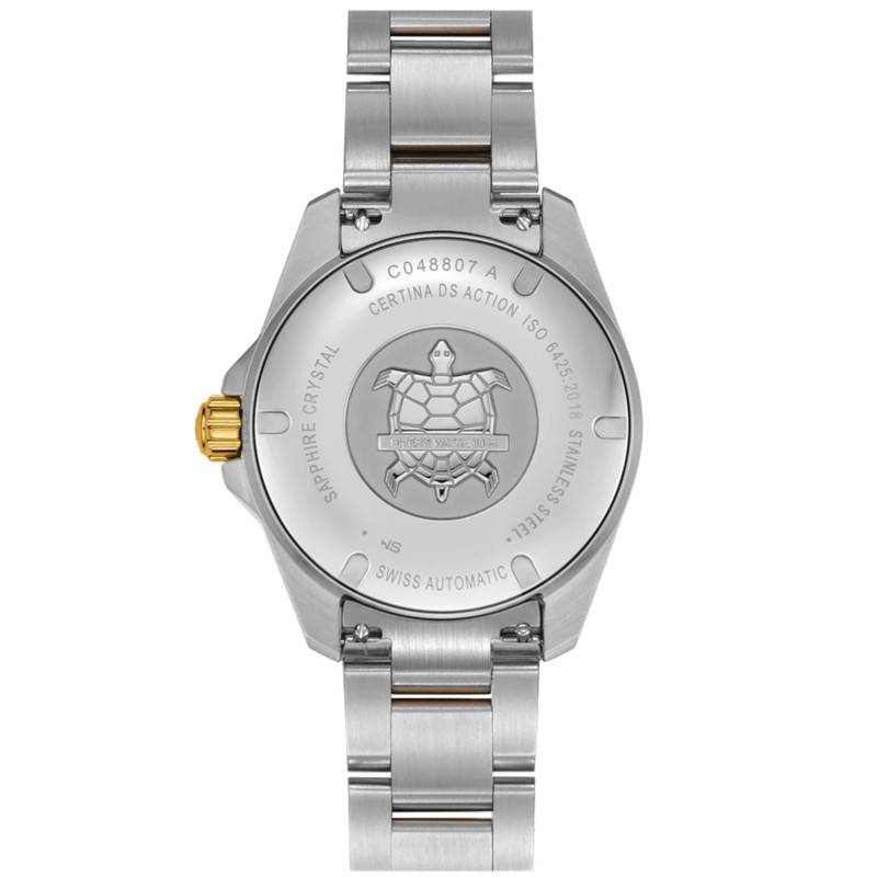 Cette montre de plongée Certina DS Action Diver 38 mm Powermatic 80 incarne la robustesse et la précision suisse. Conçue pour les amateurs de plongée, elle allie une structure en acier inoxydable 316 L et des éléments en PVD Gold, offrant une durabilité remarquable et un esthétisme séduisant. Le boîtier rond d'un diamètre de 38 mm confère à ce modèle un format idéal pour offrir confort et lisibilité en conditions sous-marines. Pesant 150 grammes, elle assure une présence tangible et rassurante au poignet. La marque a choisi un fond vissé, garantissant une étanchéité de haute qualité à 30 ATM, ce qui permet non seulement de l'utiliser en plongée, mais aussi de résister aux conditions les plus extrêmes. De plus, la montre est dotée d'une couronne vissée qui renforce l'étanchéité globale et protège le mécanisme interne.