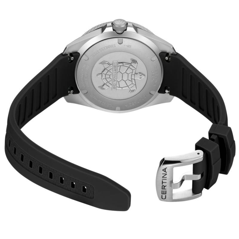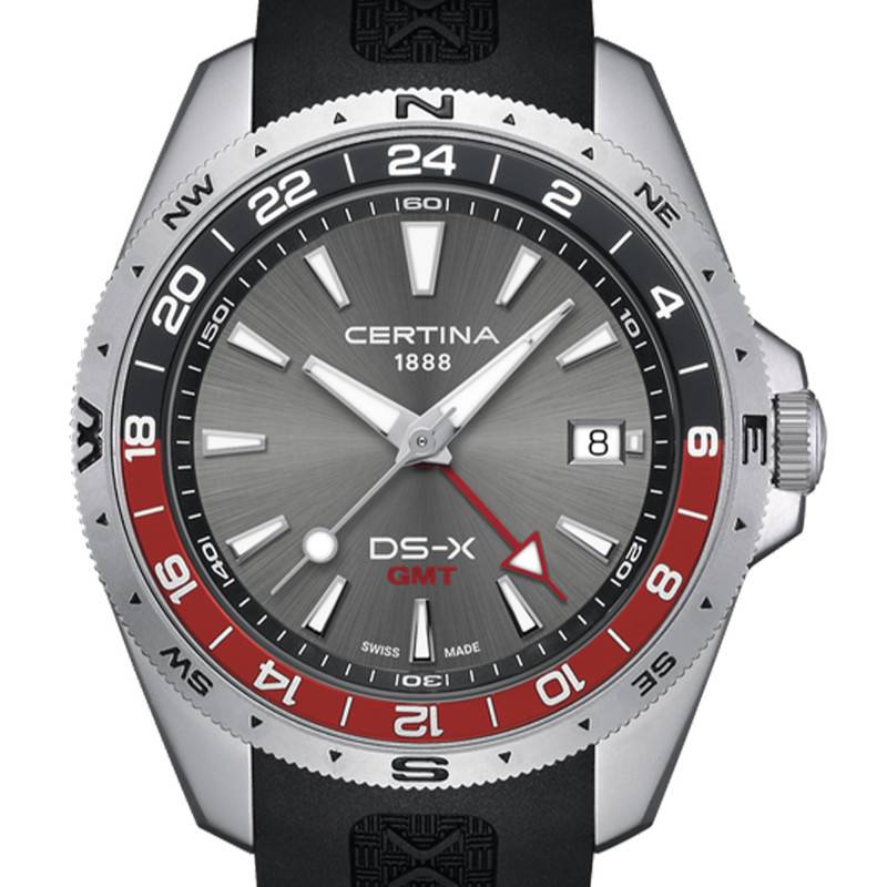La montre Certina DS-X GMT présente une allure robuste et moderne grâce à son boitier en forme de tonneau réalisé en acier inoxydable 316L. Ce matériau de haute qualité assure non seulement une excellente résistance à la corrosion, mais offre également un aspect contemporain adapté à toutes les occasions. Avec ses dimensions équilibrées, un diamètre de 41 mm et une épaisseur de 12,15 mm, elle offre un confort parfait sur le poignet tout en affichant une présence assurée. Le poids de 105 g confère à cette montre une sensation de solidité qui accompagne son design audacieux. Le boitier abrite un fond vissé qui garantit une étanchéité performante pour des aventures aquatiques jusqu'à 20 ATM. Le boitier est couronné d’une lunette bi-directionnelle en aluminium, idéale pour le suivi des temps en traversée.