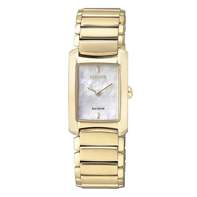 La maison horlogère japonaise Citizen étend sa gamme Eco-drive avec ce modèle féminin. Ce garde-temps a la particularité de convertir la lumière naturelle ou artificielle en énergie pour faire fonctionner le mécanisme au coeur du boîtier afin de vous offrir une lecture analogique de l'heure optimale. Ce fonctionnement est au coeur de ce boîtier en acier revêtu de PVD de couleur jaune. Sa forme rectangulaire affiche les dimensions résolument féminines suivantes : 30 mm de longueur et 20 mm de largeur. Sa lunette dorée et polie vous dévoile à 3 heures une couronne remontoir qui permettra de régler les aiguilles des heures et des minutes à votre souhait. De plus, vous retrouverez un verre saphir au-dessus de son cadran, reconnu dans le monde horloger pour sa haute résistance contre les rayures et chocs. Enfin, notez que son fond de boîte est emboîté et vous offrira une étanchéité de 5 atmosphères.