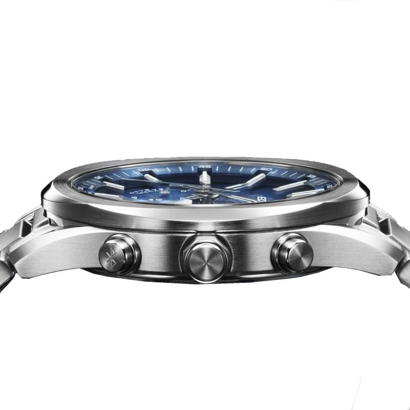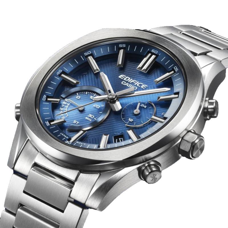Le cadran de la Casio Edifice EQB-1300 est une véritable œuvre de raffinement horloger, envoûtant par sa couleur bleue intense et sa finition soleillée. Des chiffres arabes et des index appliqués renforcent la lisibilité tout en ajoutant une dimension esthétique moderne grâce à leur traitement Neobrite, qui assure une visibilité optimale même dans l'obscurité. Le cadran comprend trois aiguilles principales : heures, minutes et secondes, toutes décrivant un mouvement fluide et précis, caractéristique du mécanisme solaire. Un guichet date se situe discrètement sur le cadran, apportant une fonction conviviale sans surcharger le design. Tout est protégé par un verre saphir plat et antireflet, un élément de qualité supérieure inaltérable face aux rayures, assurant ainsi une visibilité claire et sans obstructions.