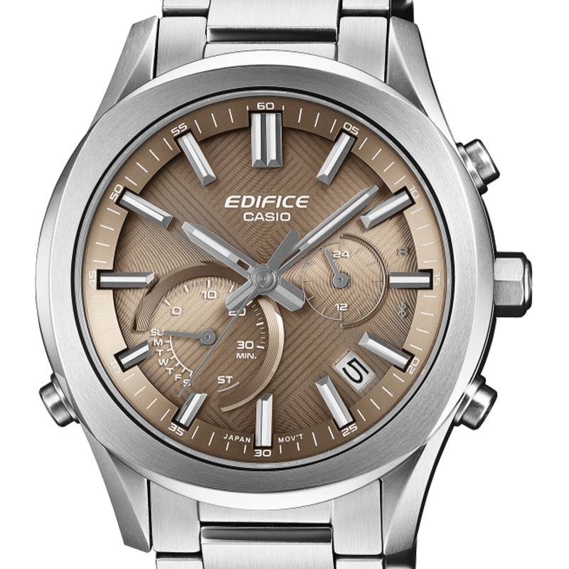 Le cadran de cette Casio Edifice est une véritable incarnation de l'harmonie entre esthétique et fonctionnalité. Sa teinte marron avec une finition soleillée confère au cadran une profondeur visuelle qui capte instantanément le regard. Les index facettés, légèrement en relief, accentuent cette dimension luxueuse et offrent une lisibilité accrue. L'horloge analogique utilise des aiguilles en neobrite pour une visibilité nocturne parfaite, indiquant les heures, minutes, secondes avec précision. Un chemin de fer parcourt la minuterie pour garantir une lecture facile et claire, même en coup d'œil rapide. Le cadran intègre également un guichet de date subtilement positionné, permettant une visualisation rapide sans encombrer l'harmonie globale du design. Protégé par un verre saphir plat avec traitement antireflets, il assure une protection maximale contre les rayures et les reflets gênants, prolongeant ainsi la clarté et la beauté du cadran sur le long terme.