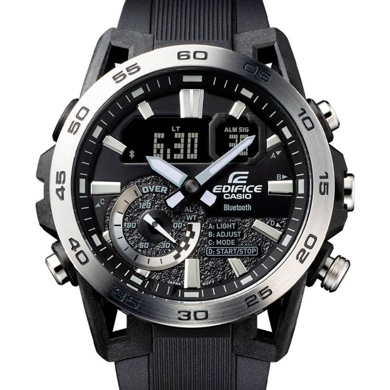 EDIFICE combine une fusion de formes dynamiques avec des conceptions de visages élaborées et de multiples fonctions. Le cadran multicouche comporte des compteurs qui rappellent un tableau de bord des voitures de course et deux aiguilles épées. Les index, incrustés, sont étonnamment grands, donnant à la montre une présence forte et solide et un aspect métallique. Un revêtement lumineux spécial qui est le Neobrite, assure un éclairage dans l'obscurité après seulement une courte exposition à la lumière. Mais la caractéristique la plus importante, c'est la technologie Bluetooth qui permet à ce dispositif de se connecter à un Smartphone et ainsi avoir accès à une multitude de fonctionnalités.