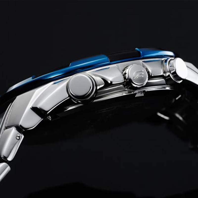 La montre Edifice de Casio s'impose aisément par son allure imposante et son design savamment élaboré. Avec un poids de 185 g, elle offre une présence charismatique remarquable à votre poignet. Mesurant 54,10 mm de longueur sur 49,50 mm de largeur, et une épaisseur de 11,70 mm, elle conserve une silhouette contemporaine et dynamique. Elle est également équipée d'une couronne et de deux boutons-poussoirs pour manipuler aisément ses diverses fonctions.