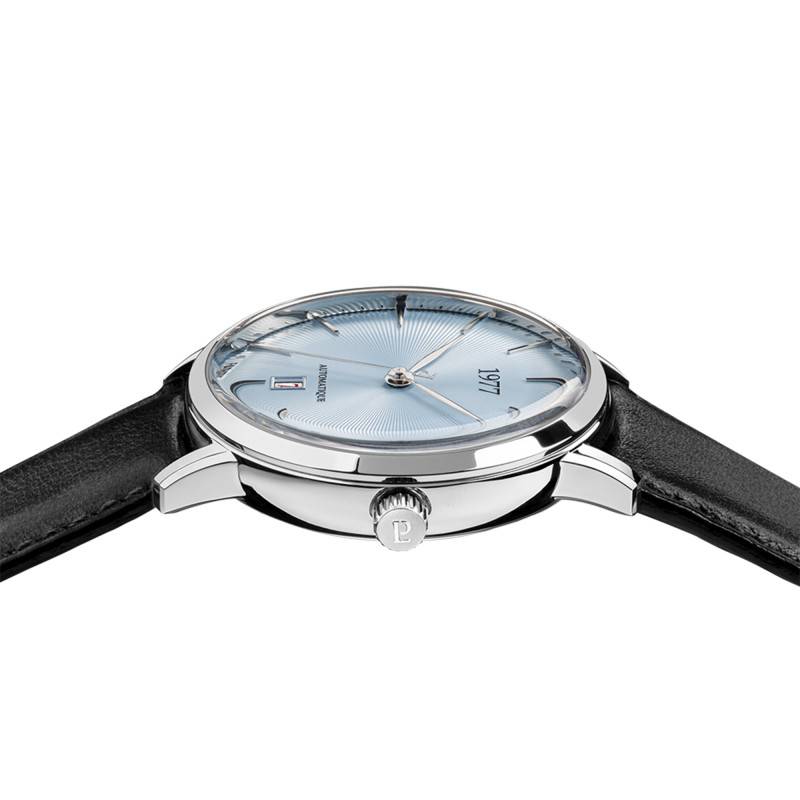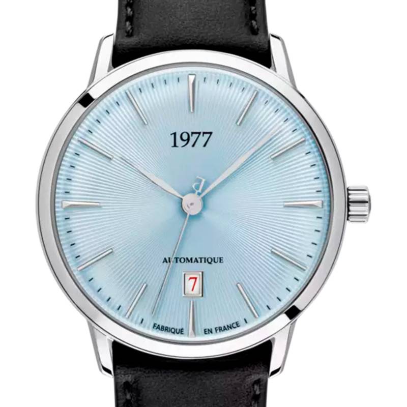 Le cadran de cette montre est revêtu d'une couleur bleu glacier, qui capte la lumière grâce à ses finitions fumées et soleillées, créant ainsi un jeu de reflets. Les index guident l'indication du temps tandis qu'un guichet date pratique est placé à 6 heures pour un accès rapide à l'information. L'usage du verre saphir assure une lisibilité parfaite tout en protégeant le cadran des aléas du quotidien. L'inscription d'une citation de Victor Hugo au dos ajoute une touche philosophique et poétique, renforçant le caractère unique de ce garde-temps.