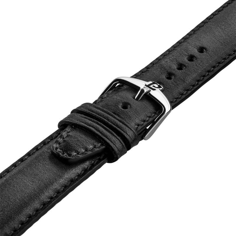 Le bracelet en cuir de veau noir donne un design intemporel à la pièce grâce à un patinage à la main réalisé par une artiste française. Avec une entrecorne de 20 mm, ce bracelet se marie parfaitement avec le boîtier. La fermeture par boucle ardillon assure une sécurité fiable tout en rehaussant l'élégance de cet accessoire.