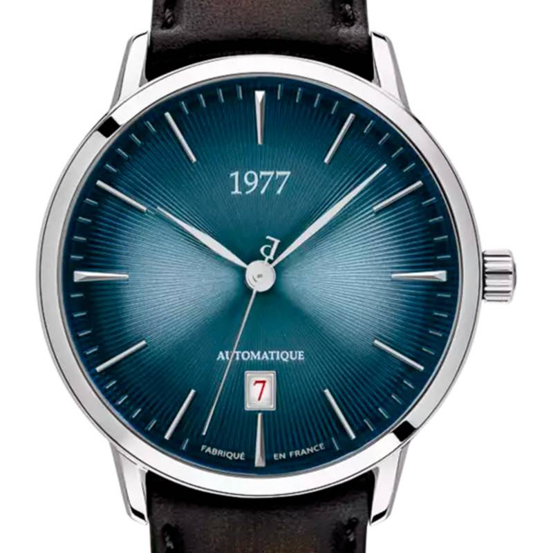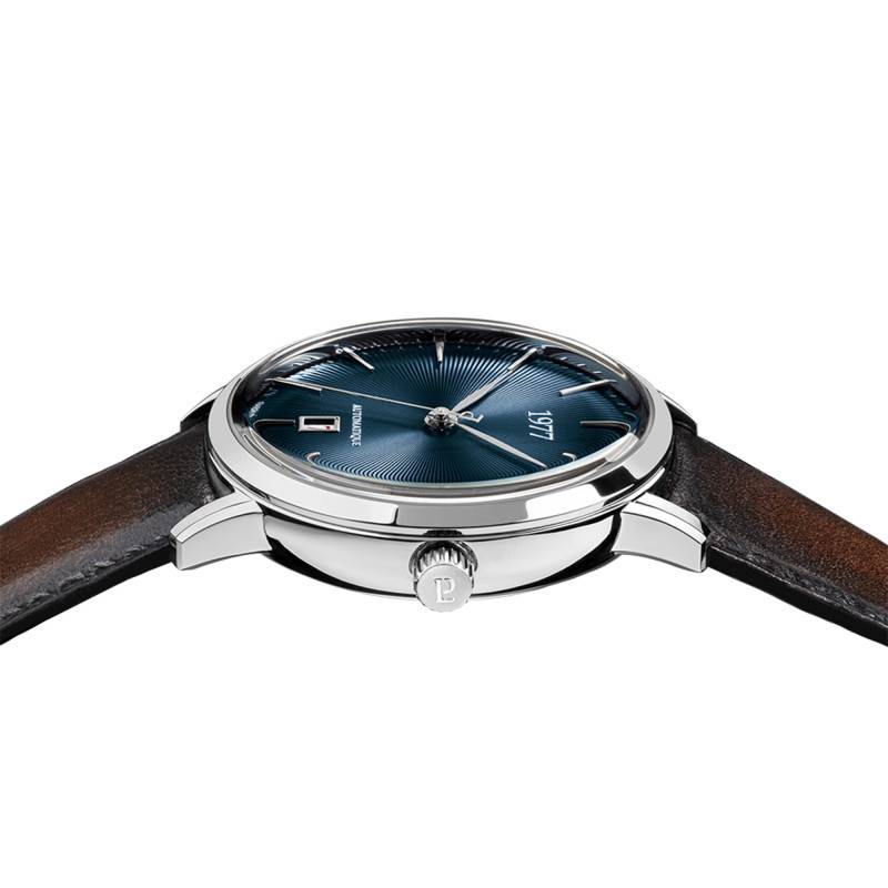 Le cadran de la montre est doté d'une finition fumée, soleillée et striée, qui joue élégamment avec la lumière et donne une profondeur supplémentaire au bleu nuit du cadran. Les index et les aiguilles apportent un contraste et une lisibilité optimale. Un guichet date se trouve intégré à 6 heures, ajoutant une fonctionnalité supplémentaire. Le verre saphir protège le cadran de l'utilisation quotidienne.