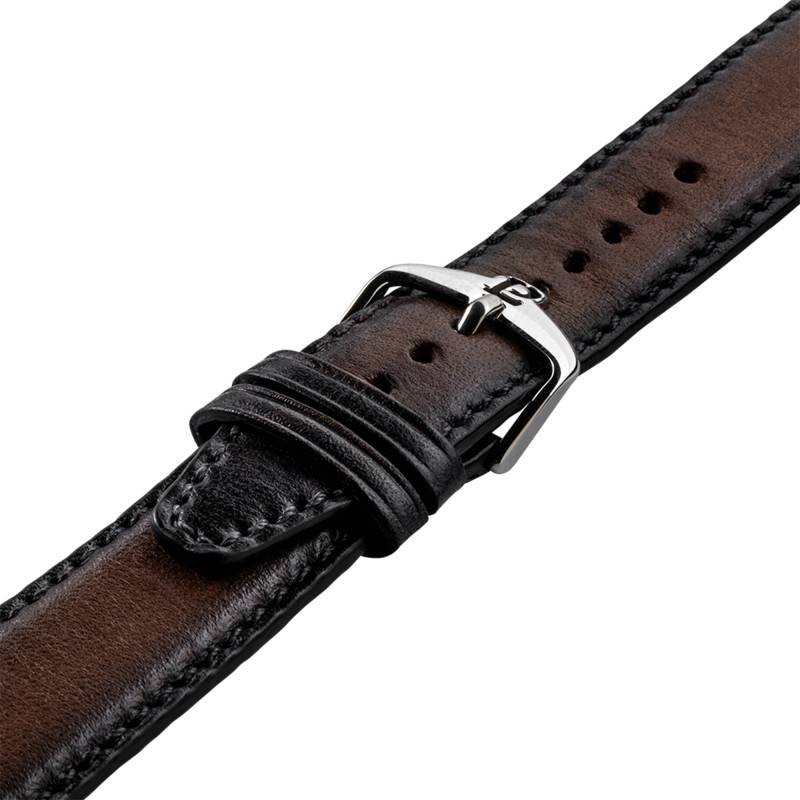 Le bracelet de la montre est confectionné en cuir de veau marron, patiné à la main par une artiste française, donnant ainsi des nuances à travers le temps. Le fermoir à boucle ardillon assure une sécurité optimale, tandis que les surpiqûres ajoutent une élégance discrète et intemporelle. Avec une entrecorne de 20 mm, le bracelet s'intègre harmonieusement au design général de la montre.