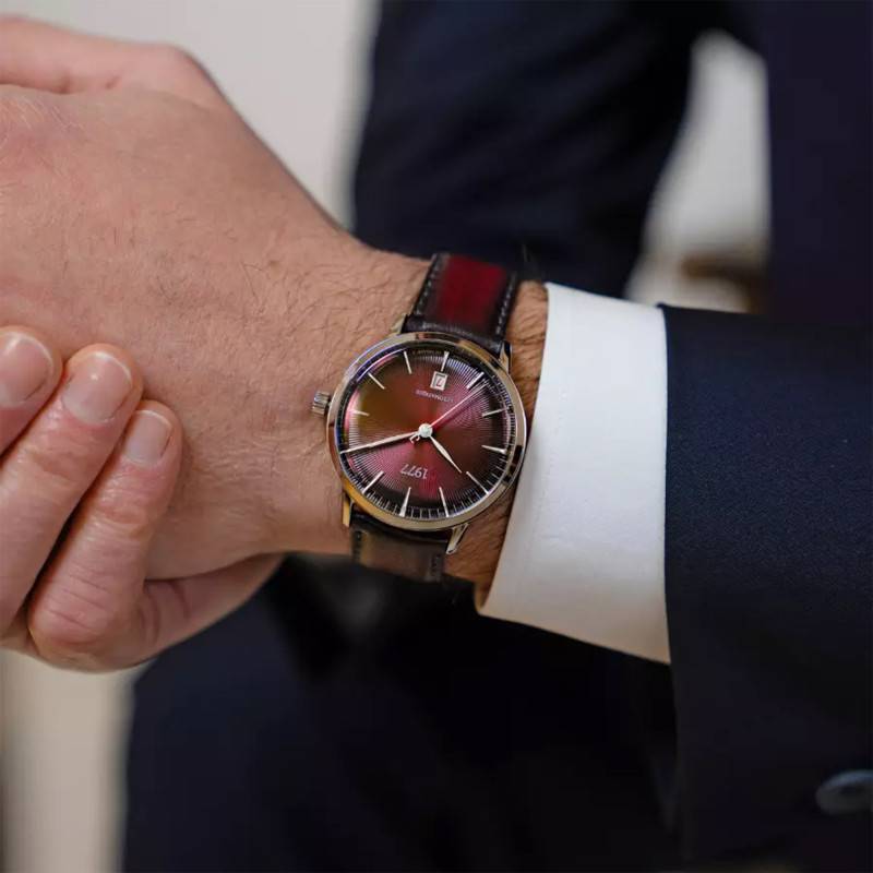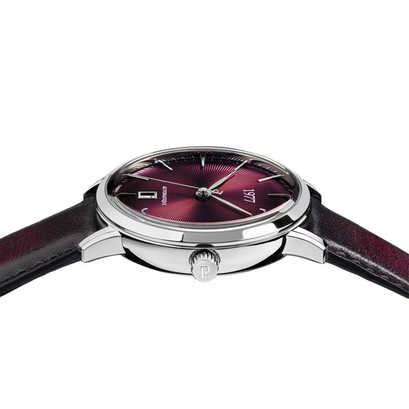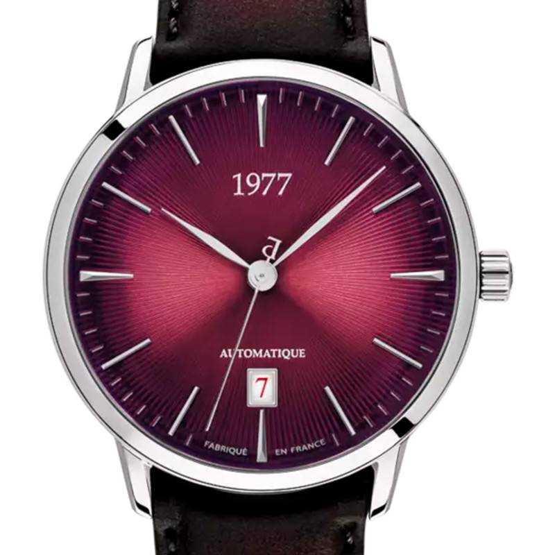 Le cadran de la montre se distingue par sa teinte lie de vin profonde, son look fumé est sublimé par des finitions soleillées et striées, créant des variations de lumière subtiles. Les index et les aiguilles de couleur argentée marquent les heures, minutes et secondes. Le guichet date à 6 heures ajoute une touche de fonctionnalité pratique à ce cadran. L'ensemble est protégé par un verre saphir, réputé pour sa résistance aux rayures et assurant une grande lisibilité.