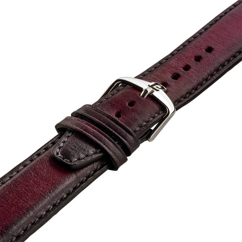 Le bracelet de cette montre complète son esthétique raffinée. Réalisé en cuir de veau, il est finement patiné à la main, révélant des nuances de couleur lie de vin qui évoluent avec le temps, conférant à chaque pièce un caractère unique. Ce bracelet en cuir véritable offre confort, avec une largeur de 20 mm d'entrecorne. La présence d'une boucle ardillon assure un maintien sécurisé tout en ajoutant une touche classique au design moderne de la montre.