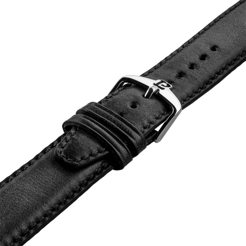 Le bracelet de cette montre est réalisé en cuir de veau de couleur noire, sublimé par une patine appliquée à la main par une artiste française, apportant distinction et richesse à l'esthétique globale. Ce cuir véritable propose des nuances délicates. Avec une entrecorne de 20 mm, le bracelet assure un confort optimal tout en épousant parfaitement la forme du poignet. Le choix de la boucle ardillon facilite une fermeture sécurisée tout en renforçant l'élégance traditionnelle de cette montre.