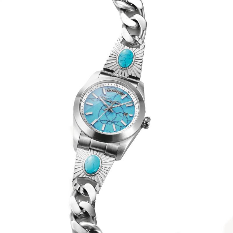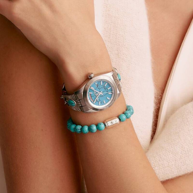 Le cadran de la montre Elyndra est véritablement une invitation à l'exploration visuelle grâce à sa finition en pierre synthétique couleur turquoise. Cette texture en 3D unique et vivante pousse à mettre en avant un esprit naturellement bohème. Affiché dans un ton bleu profond qui se révèle à chaque regard, le cadran présente une illusion de dimension et de profondeur. Les aiguilles et les index, s'imposent par leur limpidité et leur lisibilité irréprochables même en conditions de faible luminosité. Le cadran est protégé par un verre minéral trempé avec un traitement saphir, assurant une barrière résistante à l'usure quotidienne tout en préservant la beauté saisissante du design. Sur ce fond inspirant, les guichets du jour et de la date se glissent subtilement pour enrichir la fonctionnalité sans distraire de l'effet visuel captivant.