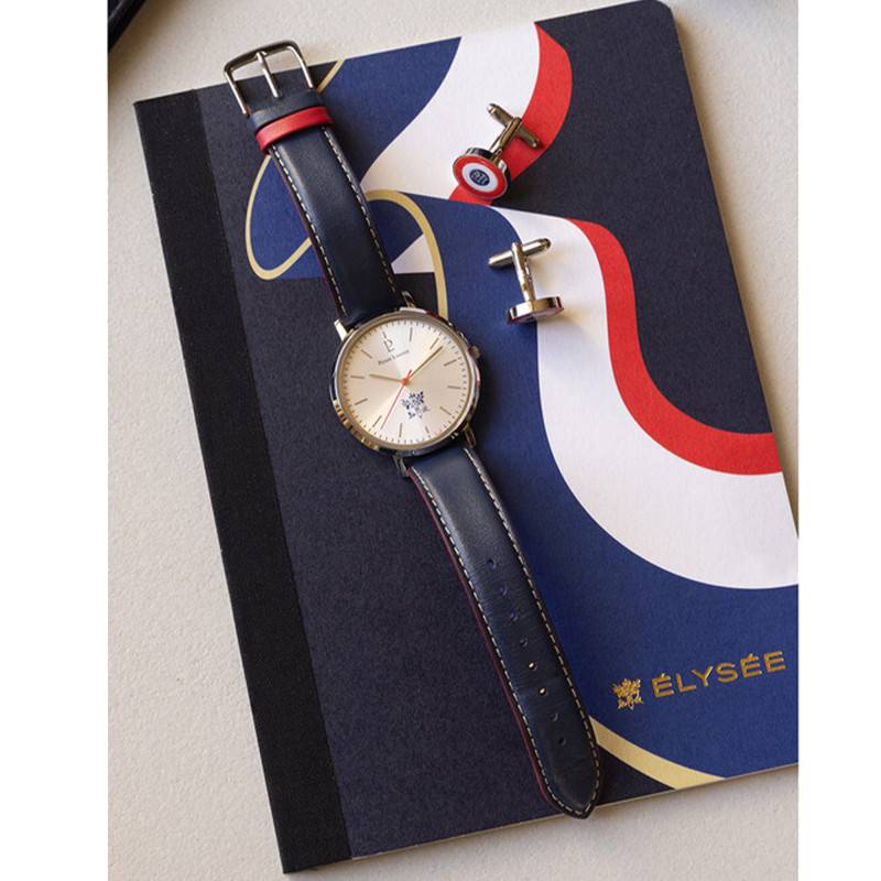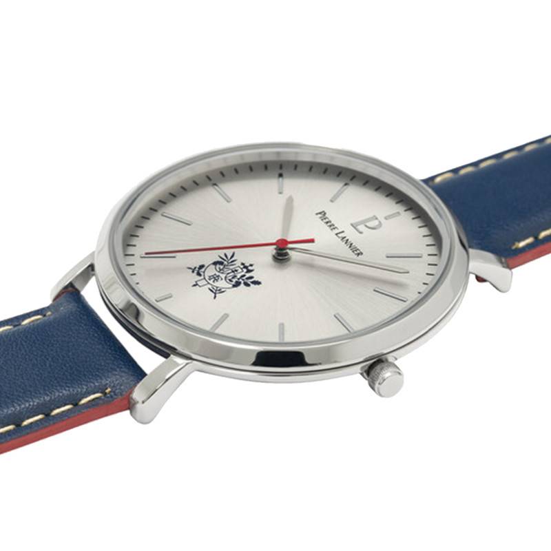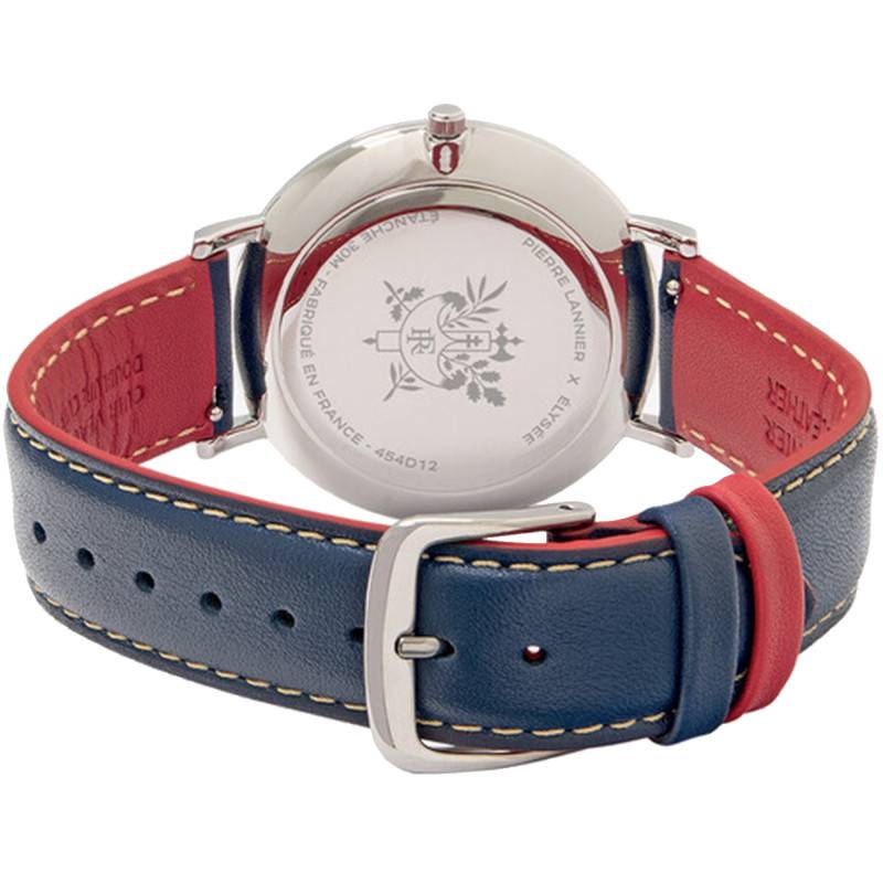 Forte d'un savoir-faire exceptionnel, la marque Pierre Lannier ne cesse de mettre en honneur l'excellence et la perfection horlogère française. Elle propose des garde-temps de haute qualité qui se démarquent par leur esthétique et leur originalité. Chaque modèle est soigneusement élaboré dans le but de vous offrir une expérience unique au poignet. C'est avec un grand honneur qu'elle vous présente la montre Elysée 454D126 inspirée de sa chère patrie, la République française. Ce garde-temps dévoile un boîtier rond qui affiche 40 mm de diamètre et 7,90 mm d'épaisseur. Celui-ci est fabriqué en acier inoxydable poli, ce qui vous confère une brillance et une résistance indéniable. Il est pourvu d'une couronne crantée et argentée qui se trouve à 3 heures et qui permet la manipulation des aiguilles fixées sous le verre minéral. Cette montre de 200 grammes dispose d'un fond emboîté qui lui assure une étanchéité de 5 ATM.