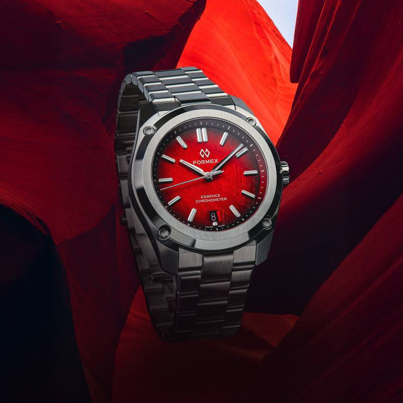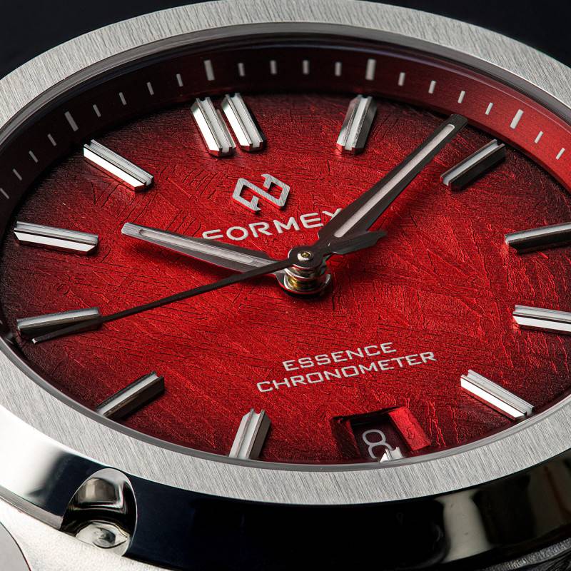 Le cadran de la Formex Essence 39mm Red Meteor est un véritable spectacle interstellaire, taillé dans une véritable météorite Muonionalusta, apportant une touche venue de l'espace à votre quotidien. La finition rouge fumé, obtenue par des procédés d'usinage et de traitement méticuleux, sublime les figures de Widmanstätten, ces motifs cristallins qui racontent des milliards d'années d'histoire cosmique. Se distinguant par sa nuance rouge unique, le cadran capture et reflète la lumière de manière fascinante. Les index luminescents assurent une facilité de lecture inégalée, même dans l'obscurité. Cet agencement est protégé par un verre saphir plat, bénéficiant d'un traitement anti-reflets qui prévient les éblouissements et assure une clarté parfaite de chaque détail élégant.
