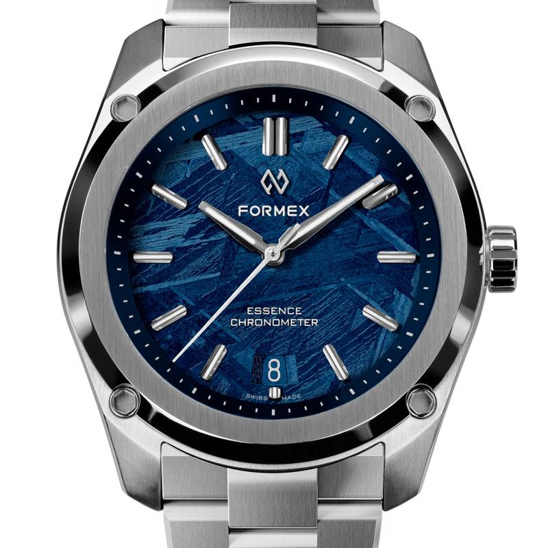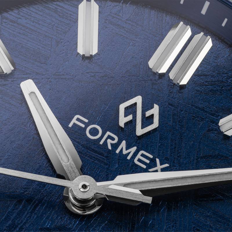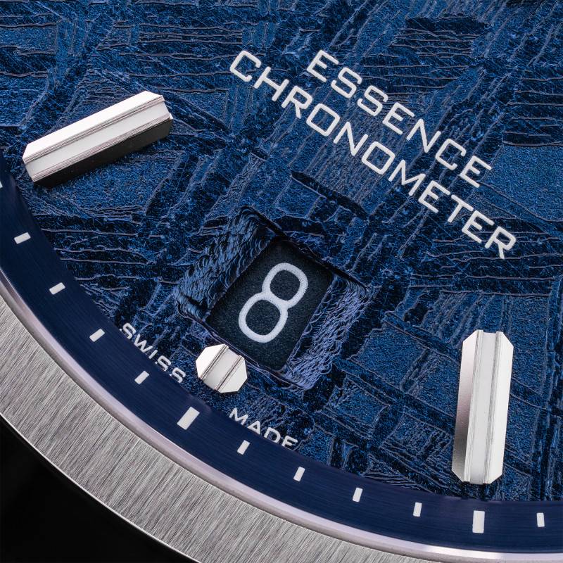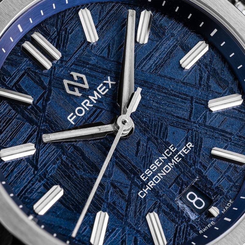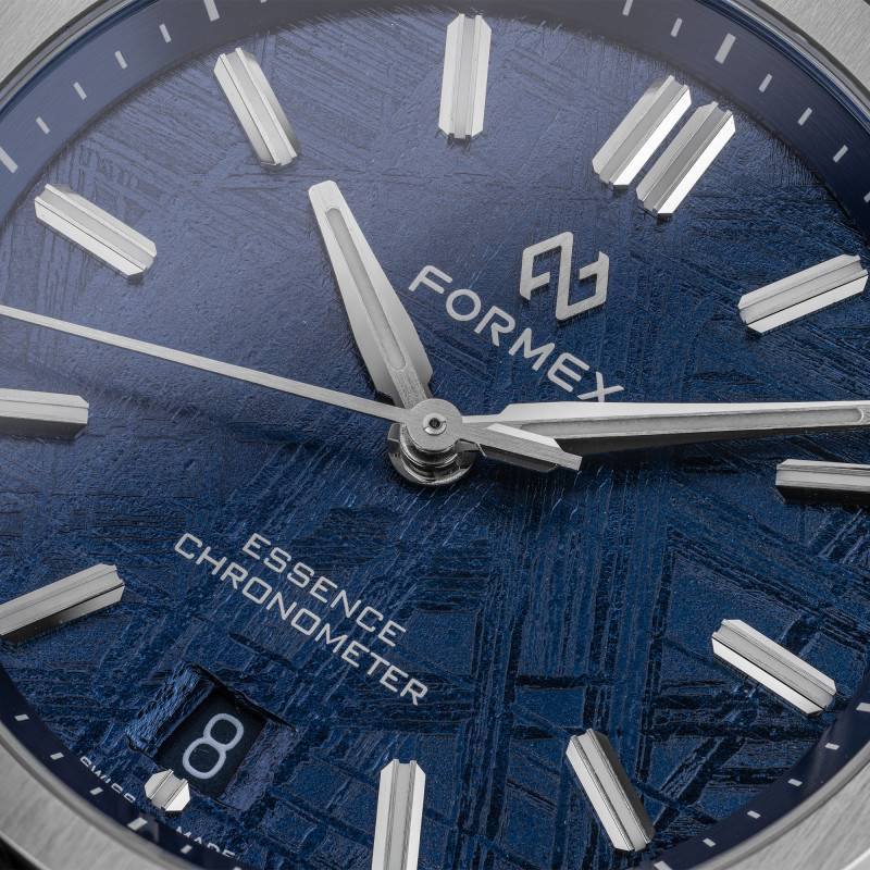 Cette nouvelle Essence 39 met en avant un charmant cadran météorite Space Blue qui captivera tous les regards posés sur votre main. Accordant à la montre un aspect plus profond et une dimension intemporelle, il arbore une forme ronde et se trouve fabriqué entièrement en météorite. Ne bénéficiant pas d'une base en laiton, ses pieds sont éléctro-soudés dans la pierre, le fixant ainsi directement au mouvement. Les charmants triangles équilatéraux de cette météorite ferreuse qui créent le motif Widmanstätten sont mis en valeur par une sublime couleur bleue obtenue par un bain galvanique, ce qui rend chaque cadran totalement unique et permet au propriétaire d'une montre Space Blue de posséder une pièce sans pareille. Outre son esthétique élégante, ce cadran offre un affichage analogique fluide et net, enrichi par une complication date qui sera donnée par le guichet biseauté installé à 6h. Ce dernier constitue un des éléments distinctifs des montres Formex, fruit du savoir-faire ingénieux de la marque. Les heures et les minutes vous seront communiquées par deux aiguilles bâtons polies de couleur grise. Celles-ci sont accompagnées par une fine trotteuse qui sert à marquer le passage des secondes. Le rehaut est gradué par des traits blancs formant un chemin de fer des minutes, tandis que le pourtour marqué “Swiss Made” loge douze index bâtons biseautés de couleur grise. Servant de repères pour les heures, ces derniers ainsi que les aiguilles sont revêtus d'une couche Super-LumiNova BGW9 blanche, garantissant une lisibilité impeccable dans les conditions nocturnes. L'index de 6h est découpé pour laisser place au guichet, tandis que celui de midi arbore une forme double bâton pour un rendu accrocheur. Pour finir, la marque appose son nom et son logo sous 12h en guise de signature et note à l'opposé le nom de la collection “Essence” avec la mention “Chronometer”.