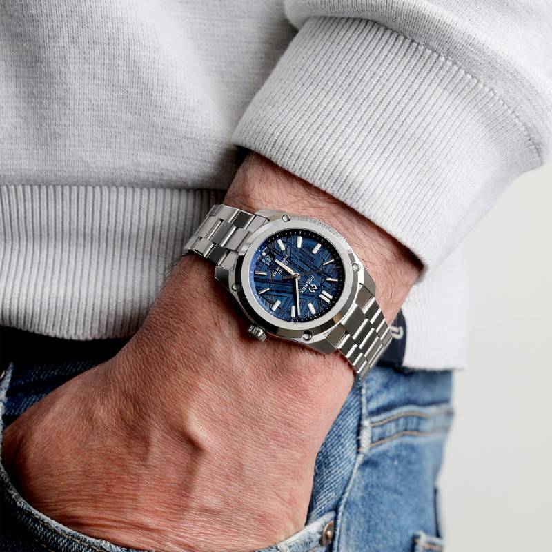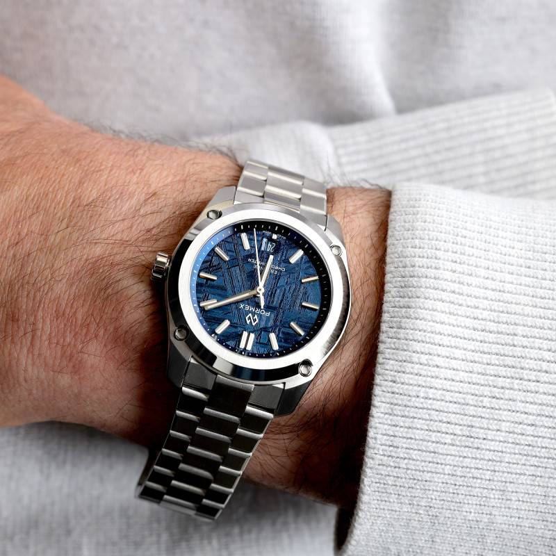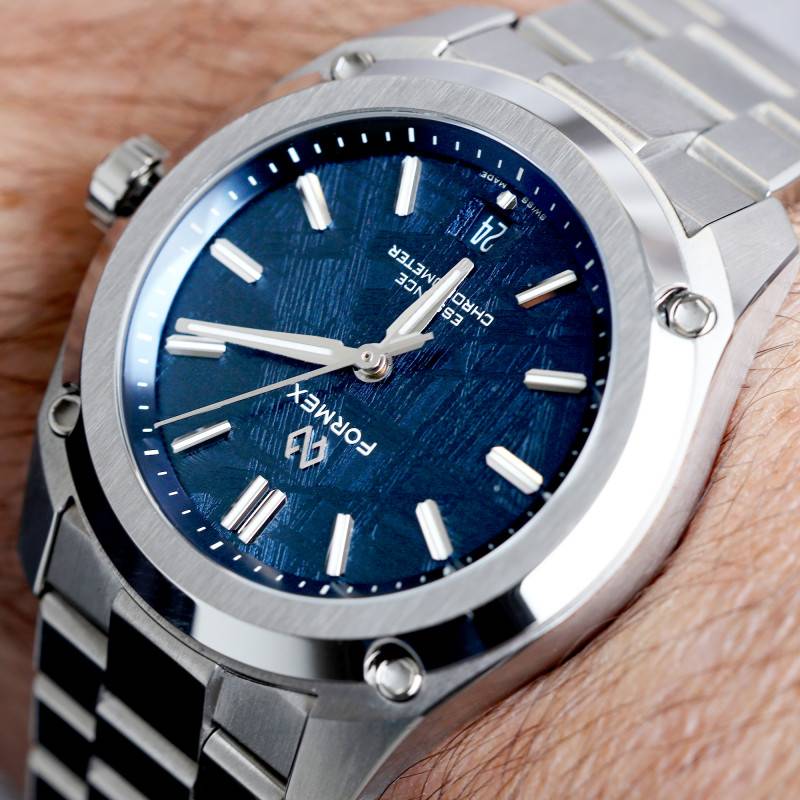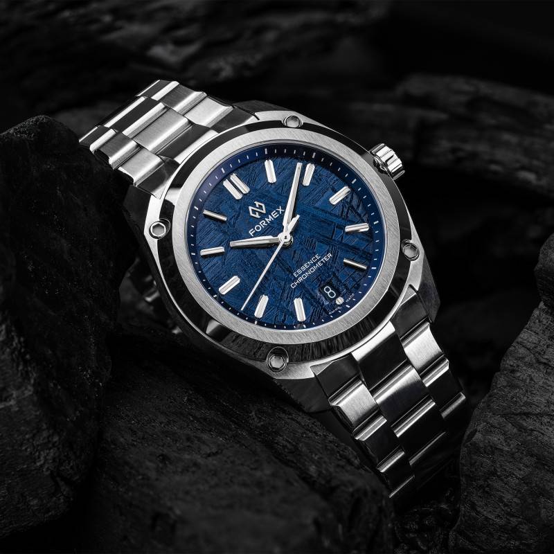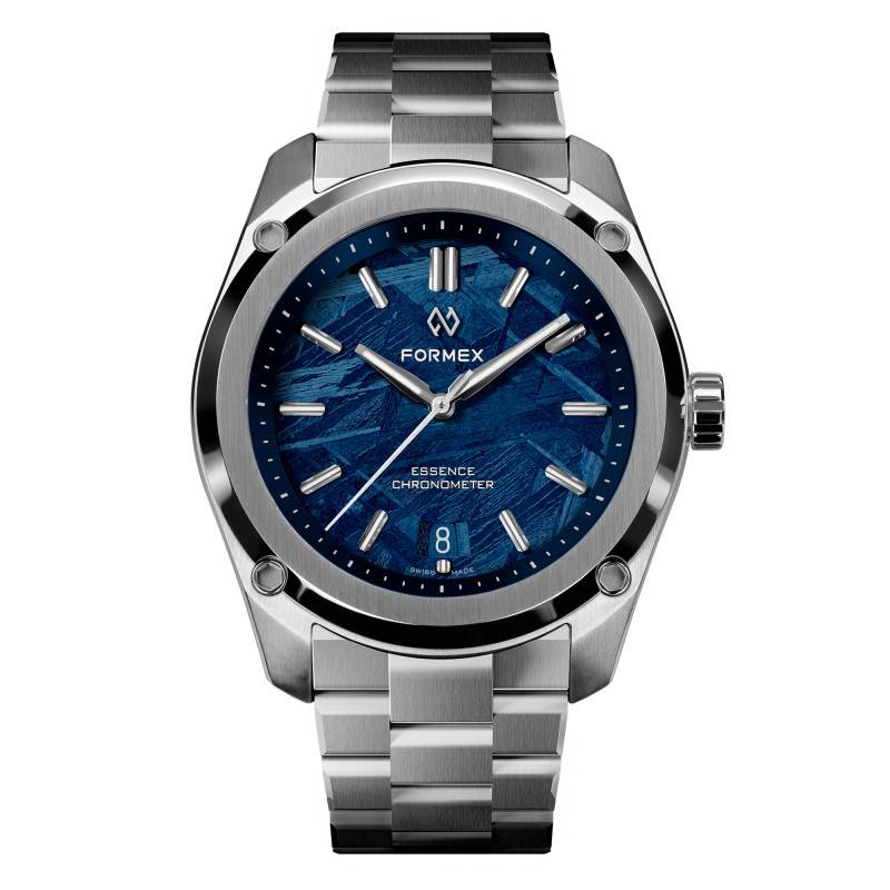 Cette nouvelle Essence 39 met en avant un charmant cadran météorite Space Blue qui captivera tous les regards posés sur votre main. Accordant à la montre un aspect plus profond et une dimension intemporelle, il arbore une forme ronde et se trouve fabriqué entièrement en météorite. Ne bénéficiant pas d'une base en laiton, ses pieds sont éléctro-soudés dans la pierre, le fixant ainsi directement au mouvement. Les charmants triangles équilatéraux de cette météorite ferreuse qui créent le motif Widmanstätten sont mis en valeur par une sublime couleur bleue obtenue par un bain galvanique, ce qui rend chaque cadran totalement unique et permet au propriétaire d'une montre Space Blue de posséder une pièce sans pareille. Outre son esthétique élégante, ce cadran offre un affichage analogique fluide et net, enrichi par une complication date qui sera donnée par le guichet biseauté installé à 6h. Ce dernier constitue un des éléments distinctifs des montres Formex, fruit du savoir-faire ingénieux de la marque. Les heures et les minutes vous seront communiquées par deux aiguilles bâtons polies de couleur grise. Celles-ci sont accompagnées par une fine trotteuse qui sert à marquer le passage des secondes. Le rehaut est gradué par des traits blancs formant un chemin de fer des minutes, tandis que le pourtour marqué “Swiss Made” loge douze index bâtons biseautés de couleur grise. Servant de repères pour les heures, ces derniers ainsi que les aiguilles sont revêtus d'une couche Super-LumiNova BGW9 blanche, garantissant une lisibilité impeccable dans les conditions nocturnes. L'index de 6h est découpé pour laisser place au guichet, tandis que celui de midi arbore une forme double bâton pour un rendu accrocheur. Pour finir, la marque appose son nom et son logo sous 12h en guise de signature et note à l'opposé le nom de la collection “Essence” avec la mention “Chronometer”.