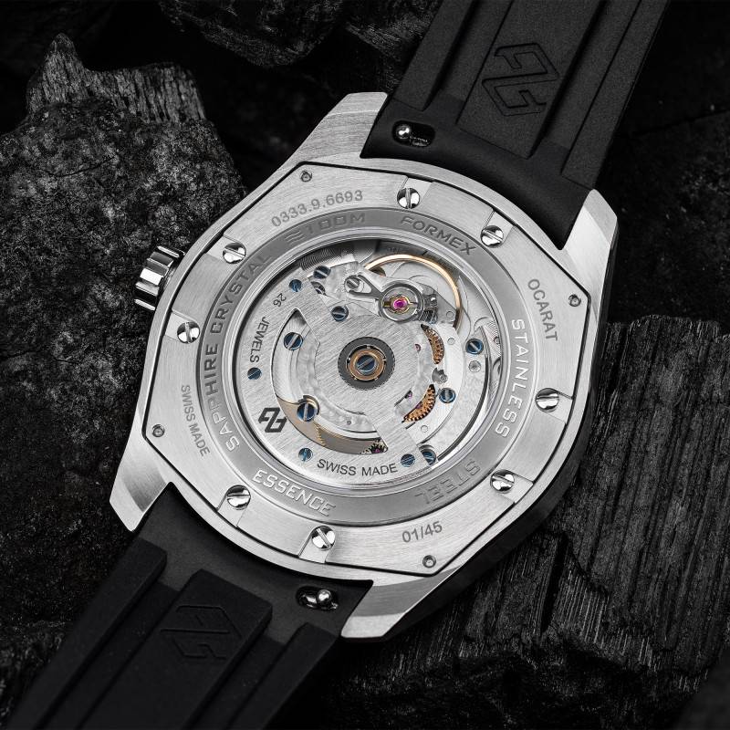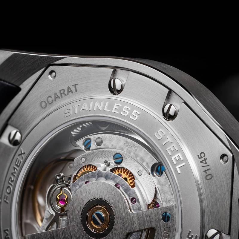 Formex est une marque d'horlogerie suisse réputée pour son ingéniosité technique, son savoir-faire inégalé et son esprit audacieux. Fondée en 1999 par deux frères passionnés par l'horlogerie et les sports mécaniques, elle présente à travers ses charmantes collections des garde-temps ultra-robustes, contemporains et polyvalents qui sont fabriqués à partir de technologies de pointe et faisant preuve d'un grand souci du détail. Ils sont conçus par des horlogers hautement qualifiés pour vous proposer la meilleure qualité. Repoussant les limites d'innovation et relevant les plus grands défis, chacune des créations de la marque est le fruit d'un mélange épuré de précision, de fonctionnalité et de forme qui répond aux besoins des plus exigeants. Formex s'est associée aujourd'hui avec notre boutique en ligne Ocarat et présente aux collectionneurs avertis, aux amateurs d'horlogerie et à toute personne en quête de nouveauté cette captivante montre Essence 39 Space Blue Formex x Ocarat. C'est une édition collaborative, ultra-limitée et exclusive, le parfait combo pour combler de joie nos chers clients ! De son cadran météorite à sa conception pointue, son mécanisme certifié COSC et son design versatile, ce modèle esthétiquement et techniquement élaboré a tout pour vous plaire. Il est vendu uniquement sur notre site Ocarat et est proposé avec seulement 45 pièces, vous permettant de vous démarquer pendant de longues années avec une pièce horlogère unique, authentique et élégante à votre image ! Il vous accompagnera dans toutes vos aventures avec une grande performance en accordant à chacune de vos tenues la touche sportive et chic qui fera toute la différence. Le boîtier rond de ce garde-temps est conçu avec le système de suspension breveté de Formex qui lui attribue des caractéristiques exceptionnelles, à savoir une résistance aux chocs, une durabilité extrême et un confort assuré. Conjuguant esthétique fonctionnelle et finition épurée, il se posera sur votre poignet avec une grande douceur en vous garantissant un port agréable tout au long de la journée. Il est fabriqué en acier inoxydable 316L et se pare d'une finition brossée/polie qui rehausse son charme en lui accordant une touche subtilement raffinée. Pour ce qui est de ses dimensions, il mesure 39 mm de diamètre, 10 mm d'épaisseur, 45 mm de longueur et affiche un poids de 65 gr, convenant parfaitement aux poignets masculins. Il est surmonté par un verre saphir pourvu d'un traitement anti-reflets qui vient couvrir le cadran. De forme plate, ce dernier offre une protection ultime contre les aléas du quotidien, une lisibilité optimale sous tous les angles et une allure élégante à la montre. Il est entouré par une lunette fixée par quatre vis apparentes et arborant une finition brossée qui vient renforcer le charme de ce modèle. Par ailleurs, une couronne au design cranté est disposée à 3h, assurant une bonne prise en main et servant au réglage des heures, des minutes et de la date. Au verso, le fond de boîte de cette édition limitée vous permettra de contempler à tout moment le mécanisme et son beau rotor, et ce, grâce à son ouverture transparente en verre saphir anti-reflet. Il est maintenu par huit vis, ce qui garantit une résistance à l'eau à une pression de 10 bar.