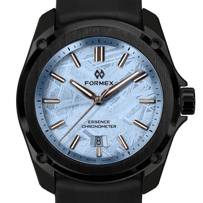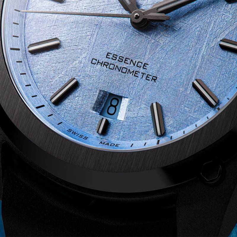 Le cadran de cette montre Formex Essence Leggera est un véritable spectacle de design horloger. Son coloris bleu Space Glacier, associé à une finition soleillée, offre une profondeur et des reflets captivants sous la lumière. Le fond en carbone décoré d'un usinage irrégulier lui ajoute une touche artistique, faisant de chaque regard une nouvelle découverte. Ce cadran s'orchestre autour d'une lecture analogique, soulignée par des aiguilles et des index luminescents, traités avec du SuperLuminova BG W9 pour garantir une visibilité parfaite même dans l'obscurité. Un guichet date élégamment positionné à 6 heures allie praticité et esthétisme, tandis que le chemin de fer des minutes offre une lecture précise des indications de temps. L'ensemble est protégé par un verre saphir plat, bénéficiant d'un traitement antireflets, imparable contre les rayures et les reflets gênants, soulignant ainsi l'engagement de Formex pour une qualité visuelle optimale.