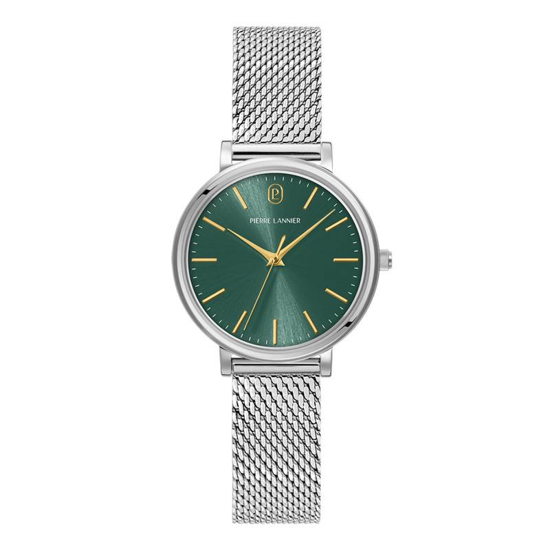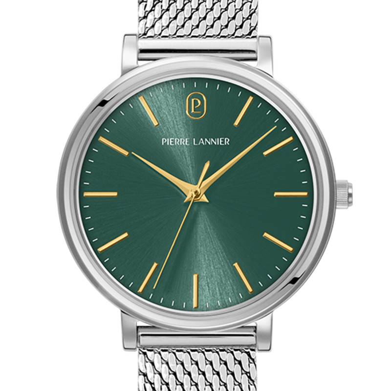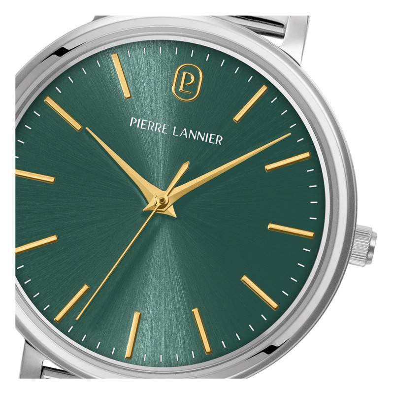 Le cadran de la montre Pierre Lannier Essential arbore une finition soleillée vert, une teinte raffinée qui ajoute un aspect luxuriant et captivant. Cette nuance de vert offre un contraste sophistiqué avec les index dorés appliqués, assurant une lisibilité parfaite. Ce cadran minimaliste est abrité par un verre minéral plat, qui non seulement protège de façon efficace contre les chocs mais met aussi en valeur la profondeur de la teinte.