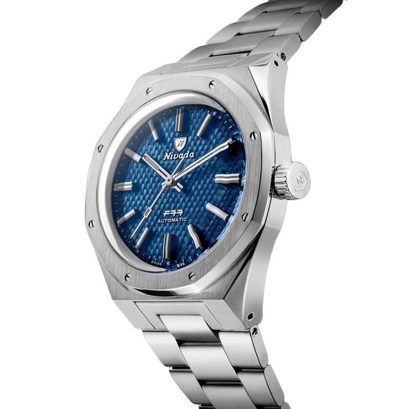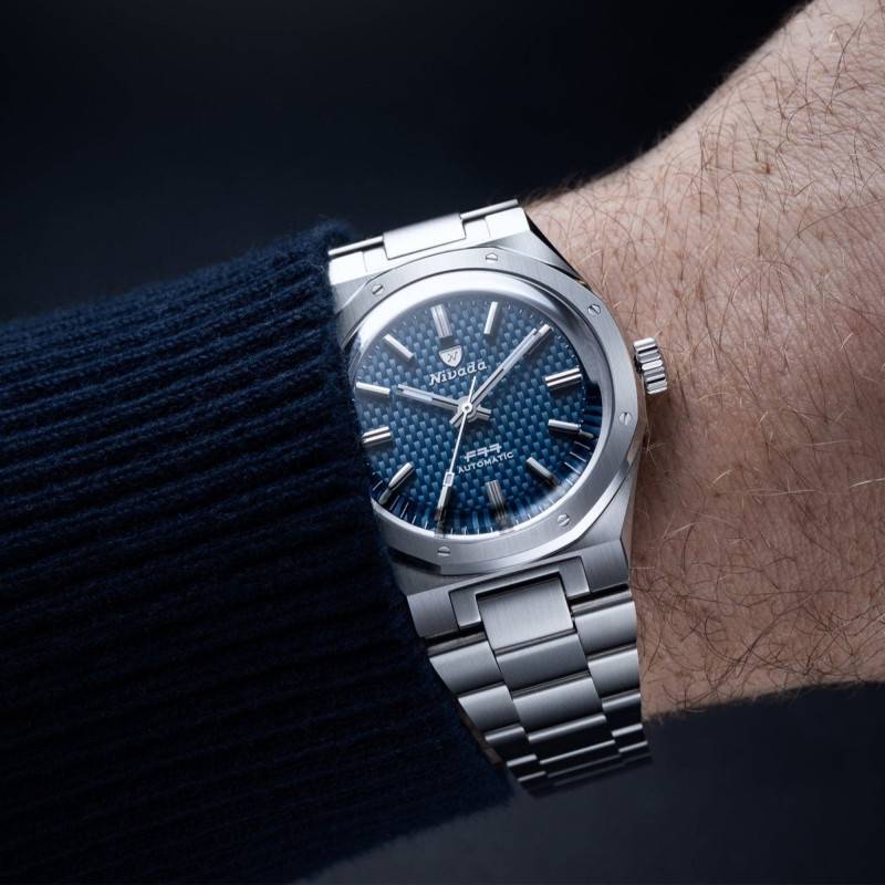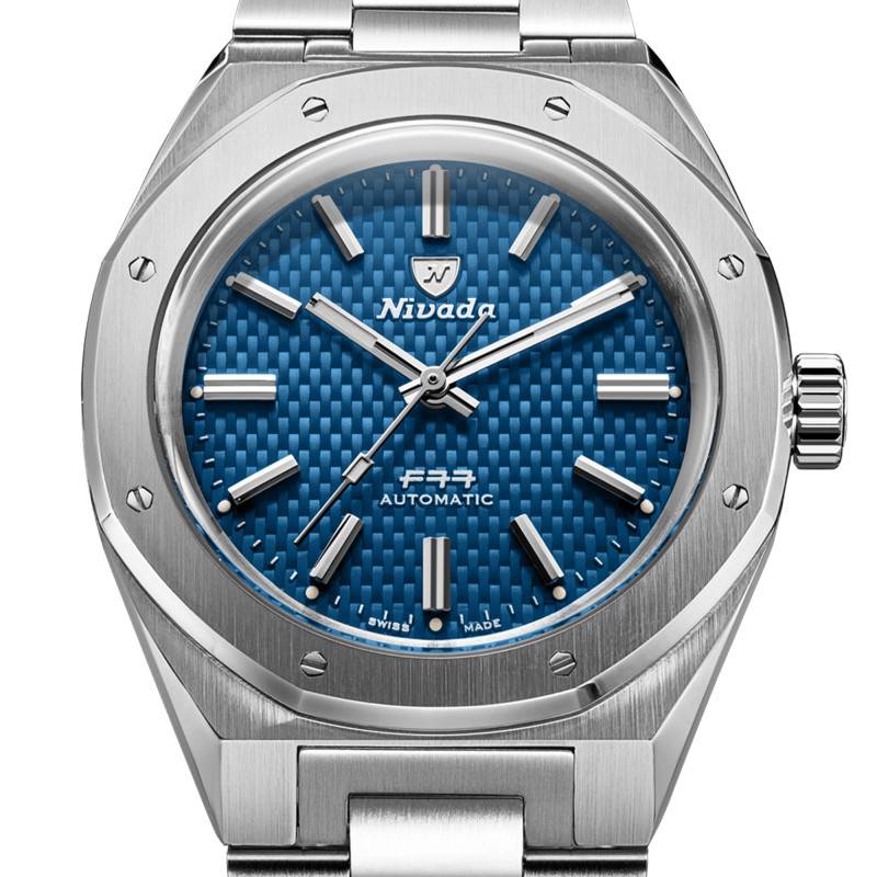 Le cadran bleu de cette sublime montre F77 est un véritable hommage à l'innovation et au style vintage. Arborant un effet carbone tressé éclatant, il capte et reflète la lumière avec une intensité saisissante, rappelant la texture d'un acier tissé. Ce jeu de lumière crée un contraste dynamique et sophistiqué avec le boîtier poli et satiné. Protégé par un verre saphir bombé et traité antireflet pour une visibilité optimale, ce cadran affiche les heures, minutes et secondes grâce à des aiguilles et index luminescents. Le chemin de fer des minutes rehausse encore l'aspect fonctionnel et esthétique, assurant une lecture précise et élégante.