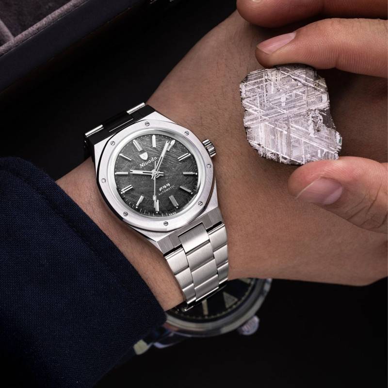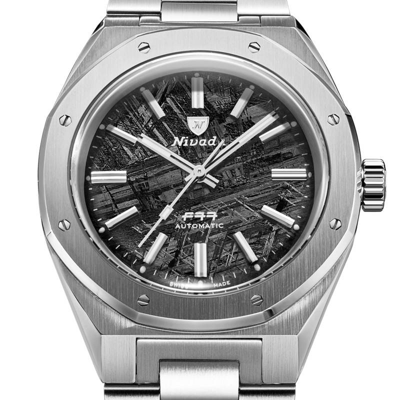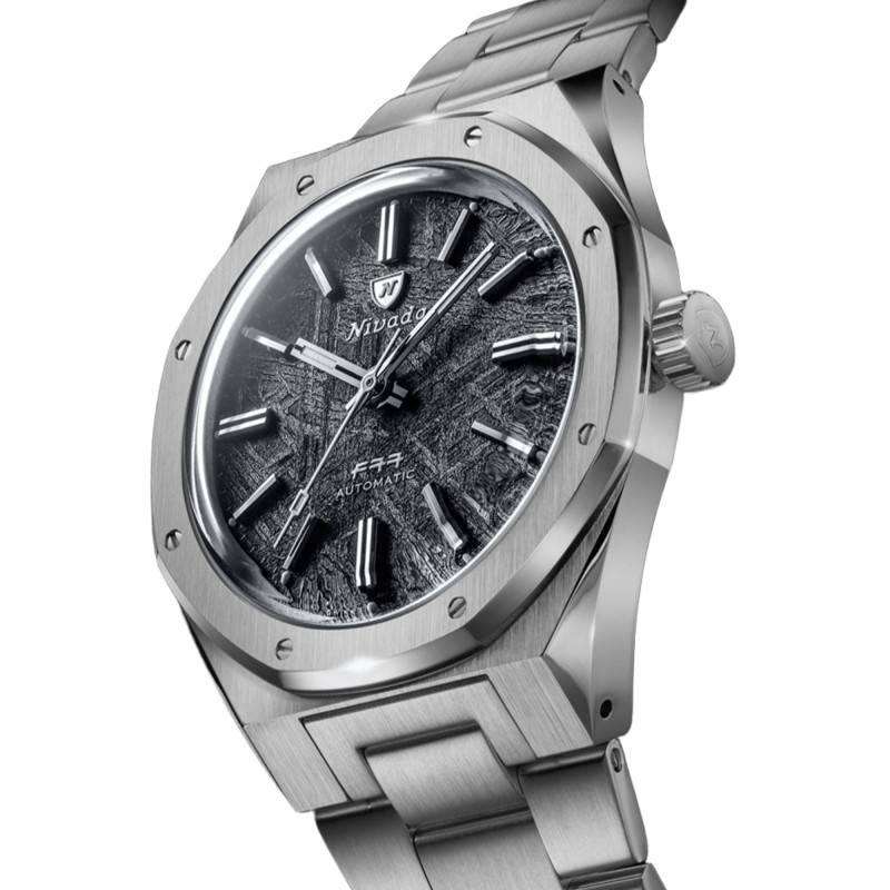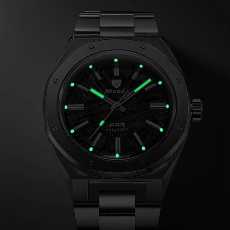 Le cadran de cette montre constitue une véritable fenêtre sur l'infini avec sa finition en météorite, apportant une texture et une histoire uniques à chaque modèle. Son apparence sophistiquée résulte d'un matériau naturellement riche en motifs, faisant de chaque montre une véritable pièce unique. Les aiguilles luminescentes se distinguent par leur efficacité et leur design qui assurent une lecture parfaite du temps, même dans les conditions de faible luminosité. Le cadran comporte des index luminescents qui accentuent son côté moderne et raffiné. Les index finement tracés et un chemin de fer minutieux accentuent la perception du temps, unissant élégance et fonction pratique.