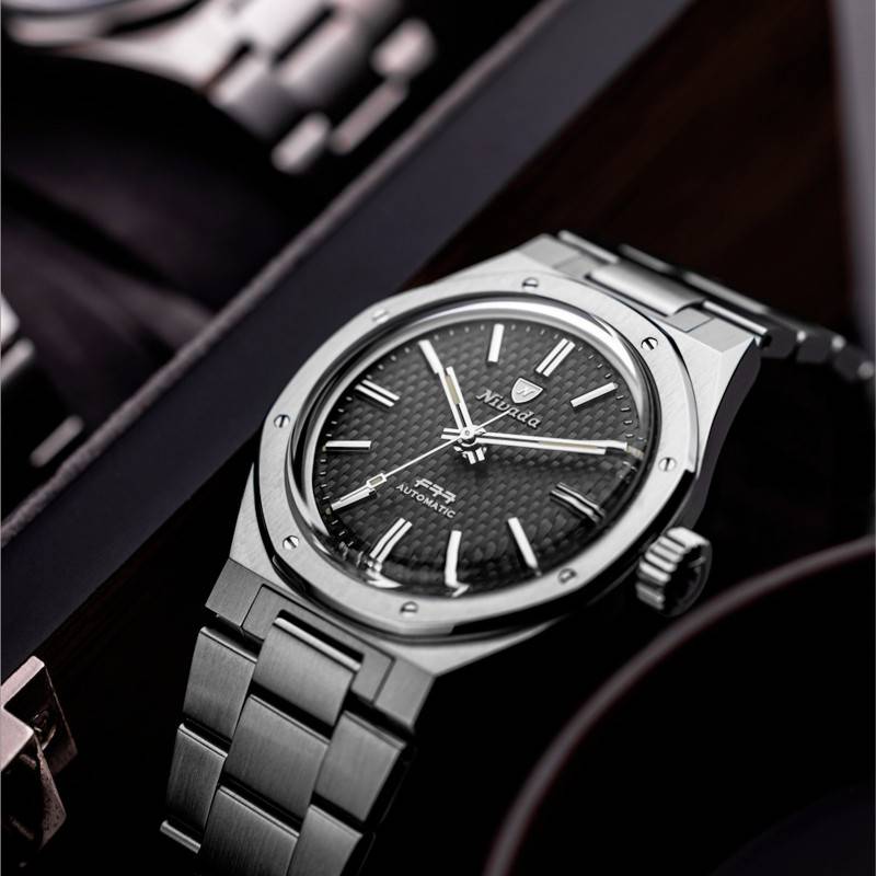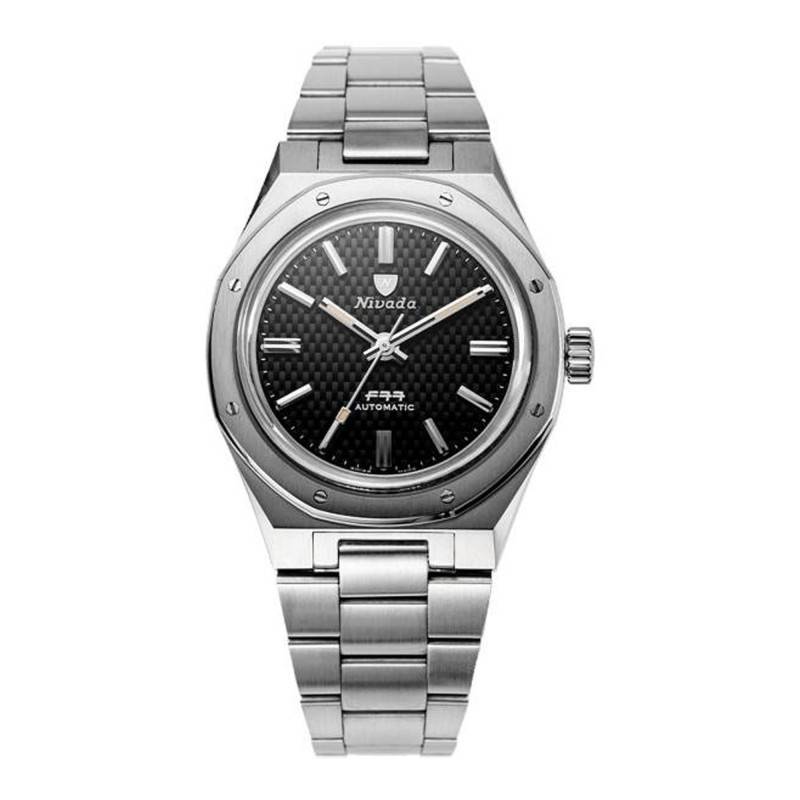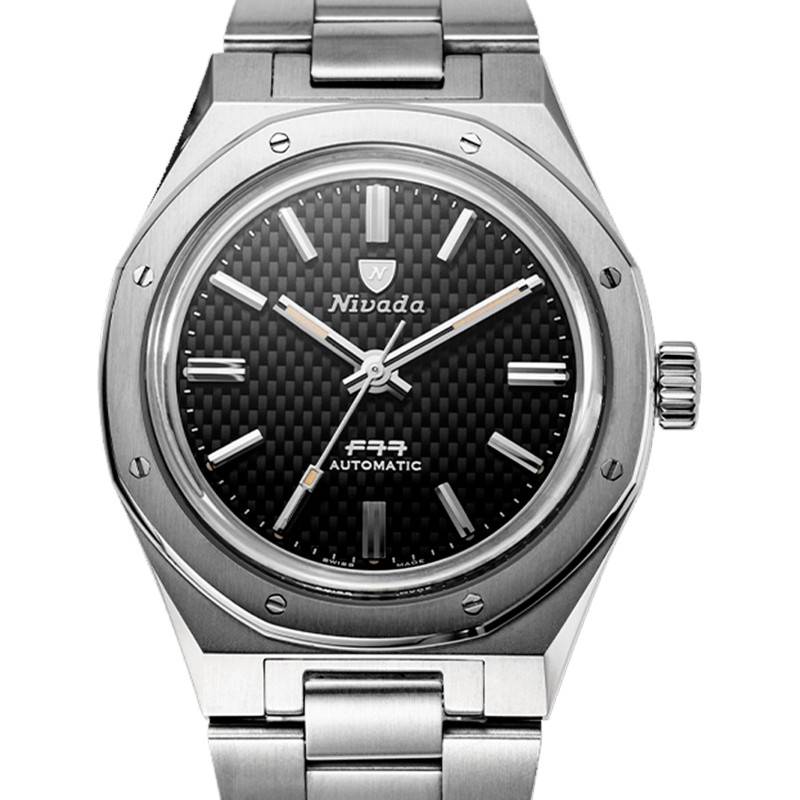 Créée en 1926, Nivada Grenchen est une manufacture horlogère suisse dont l'appellation illustre parfaitement les valeurs fondamentales de la marque, à savoir la précision et l'innovation. Elle s'est fait particulièrement connaître dans les années 60 en réalisant des garde-temps robustes, fiables et accessibles. Aujourd'hui, la marque perpétue sa tradition en proposant des montres de qualité tout en maintenant un niveau d'élégance et de performance technique satisfaisant. Parmi ses créations, il y a la F77 qui est un modèle emblématique lancé pour la première fois dans les années 70. Celle-ci est rééditée ici pour le plus grand plaisir des amateurs d'horlogerie vintage. Cette montre est livrée avec un diamètre de 37 mm, une épaisseur de 12,60 mm pour une longueur de 45 mm. Très charmant, son boîtier tonneau affiche un style prononcé et une allure sportive. Conçu en acier inoxydable 316L, il arbore des finitions satinées et brillantes alternées qui ajoutent de l'éclat à la montre. Doté d'un traitement anti-reflet, un verre saphir bombé couvre le cadran en lui offrant une excellente protection contre les rayures. Sur le côté droit de la carrure, vous trouverez une couronne légèrement surdimensionnée qui est vissée à 3h. Elle assure le réglage des heures et des minutes. Un autre détail qui attire l'attention est la lunette de forme octogonale qui est maintenue par huit vis. Le fond de boîte vissé est marqué par le logo de la maison accompagné du fameux F77. Il permet une étanchéité de 10 ATM.