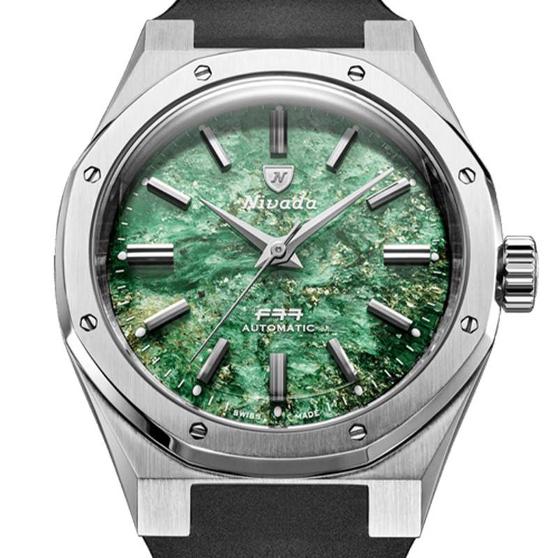 Le cadran de cette montre est sans conteste le point culminant de son design. Réalisé en pierre véritable d'aventurine, il présente un vert éblouissant qui varie sous différents angles de lumière, créant un jeu visuel captivant. Les index appliqués offrent une lisibilité optimale, soulignés par un chemin de fer des minutes minutieusement détaillé qui confère une précision au regard. La protection en verre saphir bombé permet non seulement de préserver la beauté du cadran mais également de résister aux rayures, garantissant ainsi une clarté exceptionnelle à long terme.