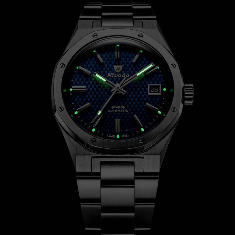 Le cadran de cette montre est une véritable œuvre d'art avec son fond carbone bleu qui capte et joue magnifiquement avec la lumière. Les aiguilles recouvertes de SuperLuminova et les index luminescents créent un contraste saisissant qui accentue la lisibilité du temps de manière spectaculaire. Les détails sont accentués par un chemin de fer des minutes minutieusement gravé autour du pourtour du cadran, permettant une lecture précise de l'heure. Ce modèle dispose également d'un guichet date optionnel, positionné de manière stratégique pour ne pas perturber l'harmonie visuelle.