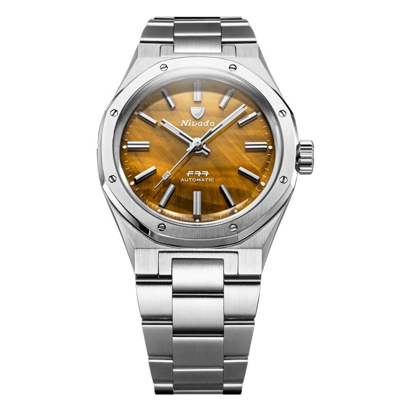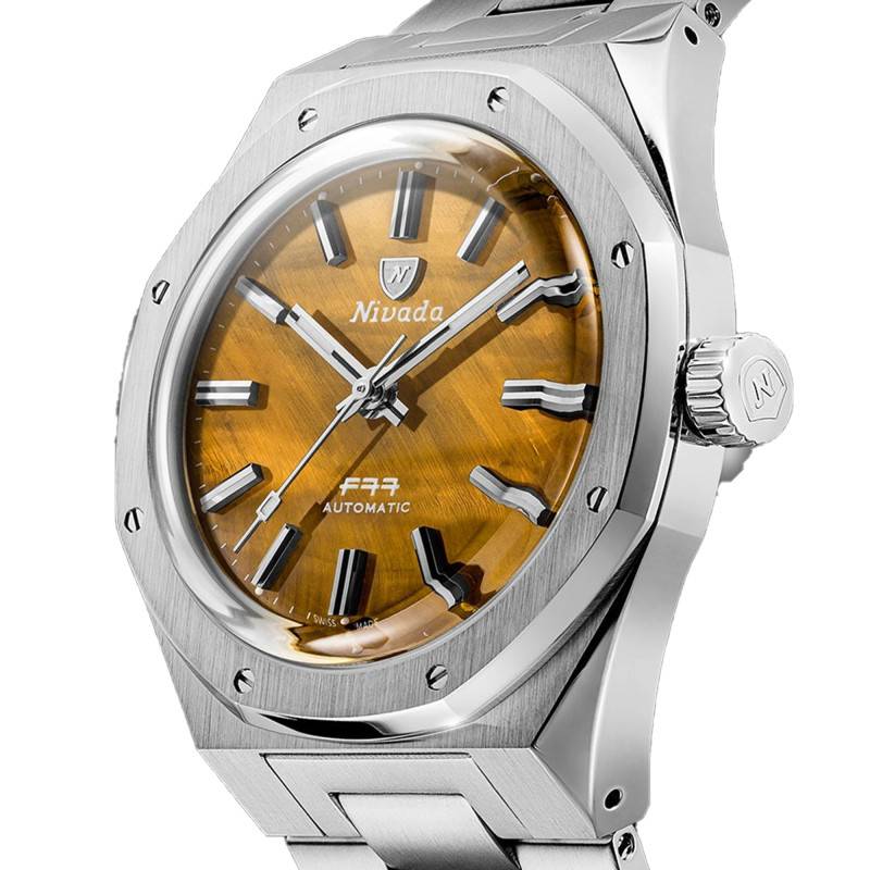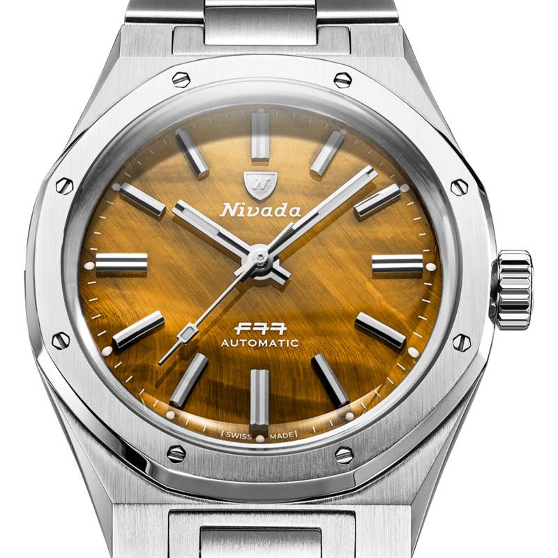 La montre F77 Tiger Eye Mark I de Nivada Grenchen se distingue par son design octogonal en acier inoxydable 316L, qui offre une élégance moderne et robuste. Avec un diamètre de 37 mm et une épaisseur de 12,10 mm, elle est conçue pour apporter un confort optimal tout en affichant un look audacieux. La finition mate du boîtier, réalisée par un travail minutieux de brossage et de satinage, accroît son charme. Ce garde-temps résolument moderne est protégé par un verre saphir bombé, reconnu pour sa résistance exceptionnelle aux rayures et aux chocs, ce qui le rend aussi durable qu'élégant. En édition limitée à 75 pièces numérotées, chaque modèle est un véritable collector.