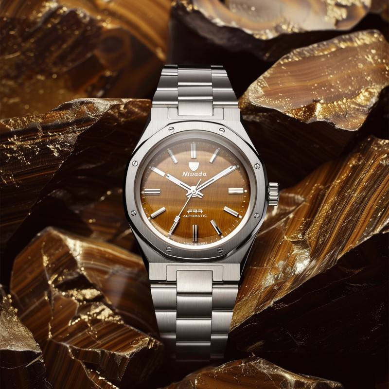Le cadran de cette montre se révèle être une véritable œuvre d'art avec sa finition œil-de-tigre d'un jaune or hypnotique. Les aiguilles luminescentes permettent une lisibilité optimale même dans l'obscurité, soutenues par des index marqués et un chemin de fer des minutes précis qui encadrent subtilement le bord du cadran. L'affichage analogique se traduit par des mouvements délicats des aiguilles des heures, minutes et secondes, offrant une expérience visuelle intensément captivante.