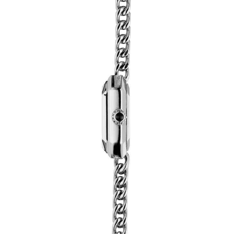 Cette montre est habillée d'un bracelet en acier inoxydable avec une finition maille milanaise. Il se ferme avec une boucle déployante simple argentée.