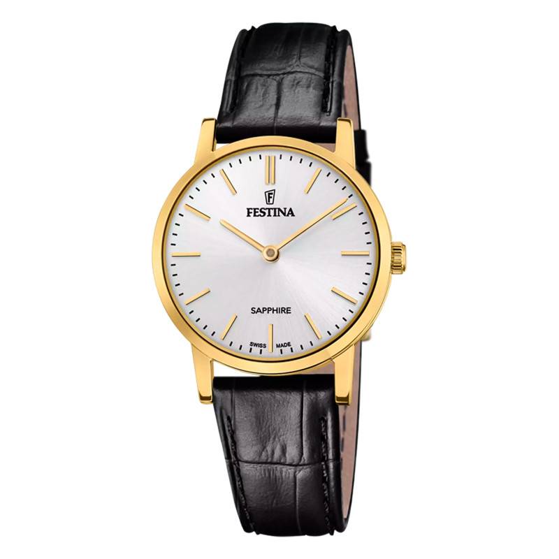Maison horlogère suisse, la marque Festina vous présente un nouveau modèle de sa collection Swiss Made. Ce garde-temps aux finitions dorées, saura séduire de nombreuses passionnées d'horlogerie. Cette montre noir et blanche viendra illuminer votre poignet. Son boîtier rond est fait d'acier inoxydable 316L revêtu d'un traitement PVD or jaune. Son diamètre de 29,3 mm est spécialement conçu pour les femmes. Le verre saphir saura protéger le cadran des chocs, des rayures mais aussi de l'usure. Afin de faciliter le changement d'heure tout en restant précis, ce modèle dispose d'une couronne remontoir à trois heures. Cette montre vous garantira également une étanchéité jusqu'à 50 mètres de profondeur, notamment grâce à son fond de boîte vissé.