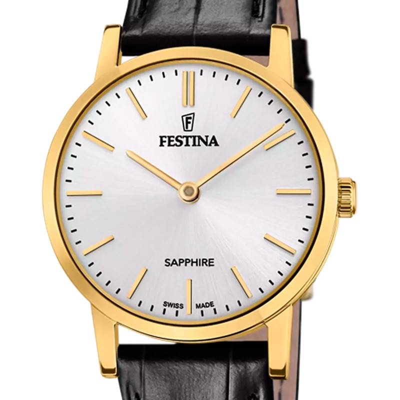 De part sa couleur blanche et sa forme ronde, ce cadran allie pureté et simplicité. Sa finition soleillée donne davantage d'éclat à la montre. Ses deux aiguilles dorées viennent indiquer les heures et les minutes tout en apportant en son centre une touche de luminosité. Le pourtour de l'écran affiche un chemin de fer des minutes constitué d'index des heures, afin d'obtenir une meilleure précision et qualité de lecture. Enfin, Festina rappelle l'étanchéité de son modèle et la qualité de son verre à six heures. La maison appose sa signature à douze heures.