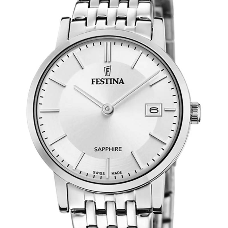 La marque Festina vous propose de découvrir le modèle F20019/1 de sa collection Swiss Made. Sobre et élégante, elle séduira les femmes élégantes avec son boîtier de forme ronde en acier inoxydable 316L. Avec son diamètre de 29.3 millimètres, ce modèle s'adaptera facilement à votre poignet. Pour protéger au mieux le cadran, on retrouve sur la montre un somptueux verre saphir, reconnu pour sa résistance aux chocs et rayures. A trois heures, se situe la couronne remontoir. Elle vous permettra d'ajuster les aiguilles des heures et des minutes facilement. Enfin, une étanchéité de 5 atmosphères vous sera assuré par le fond de boîte emboîté, qui empêche l'eau de s'infiltrer dans le boîtier.