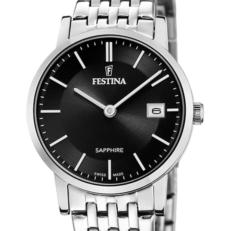 La montre Festina affiche un cadran de forme ronde et de couleur noire. Les deux aiguilles se trouvant au centre de celui-ci vous indiqueront les heures et les minutes avec précision. Sa finition soleillée illuminera votre poignet pour encore plus d'élégance. Ajoutez à cela, les index bâtons vous indiqueront les heures et le chemin de fer argenté vous affichera les minutes pour une fiabilité hors du commun. Afin de vous repérez d'autant plus dans le temps, cette montre est équipée au niveau des trois heures d'un guichet date. La signature de la marque est présente en-dessous du niveau des douze heures, et enfin vous retrouverez également la mention "Sapphire" au niveau des six heures, qui renvoie au prestigieux verre de la montre.