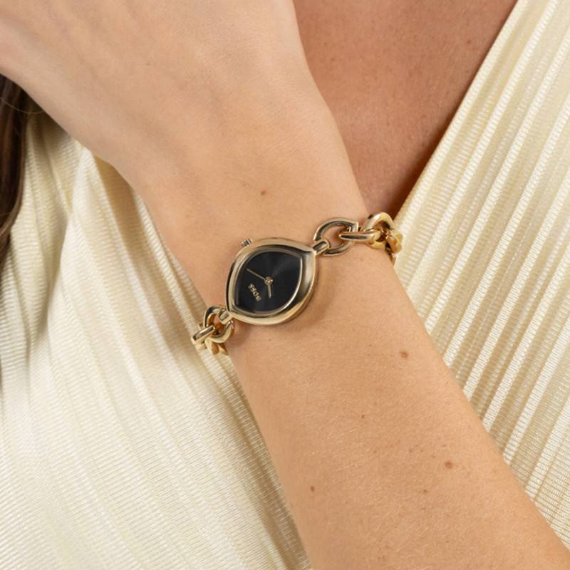 Cette montre se distingue également par son bracelet en acier inoxydable de couleur dorée, magnifiquement poli pour accentuer un look moderne et chic. Doté d'une boucle clipable, le bracelet s'ajuste confortablement à votre poignet, intégrant parfaitement la montre à vos mouvements quotidiens.