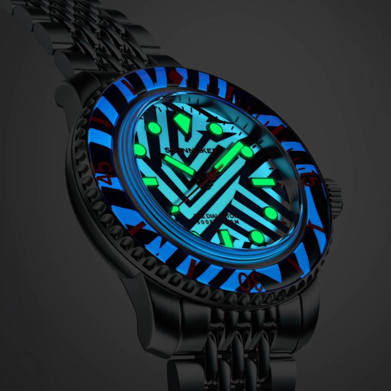 Le cadran de cette montre est une véritable œuvre d'art peinte à la main par l'artiste britannique Chris Alexander, rendant chaque pièce unique. Le motif Razzle Dazzle attire immédiatement l'œil et force l'admiration. Ce design complexe est parfaitement mis en valeur par les aiguilles et les chiffres arabes luminescents qui garantissent une visibilité optimale, même dans l'obscurité. Le cadran inclut un chemin de fer des minutes, permettant une lecture précise et détaillée du temps. Le traitement Superluminova de la finition renforce cet effet, transformant chaque consultation de l'heure en une véritable expérience esthétique.