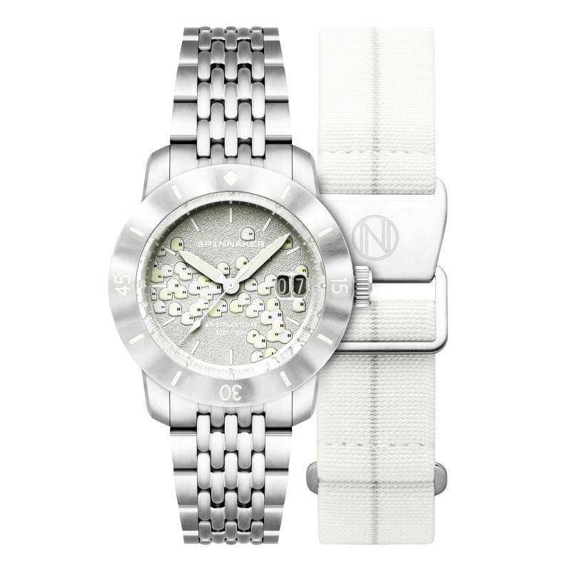 Le cadran de la montre Fleuss 40 Automatic Seconde Seconde 2025 Edition Phantom Steel est une œuvre d'art à part entière. Orné d'un motif de fantômes unique, il se démarque par son originalité et invite à l'exploration. Les aiguilles luminescentes de style moderne glissent avec aisance au-dessus du cadran, accompagnées par des index également luminescents, assurant une lecture précise en toute circonstance. Le double guichet de date, situé de manière judicieuse, permet une lecture claire et rapide du calendrier. Le choix des couleurs, un élégante combinaison de blanc et gris, est savamment orchestré pour apporter une note de sophistication et de modernité.