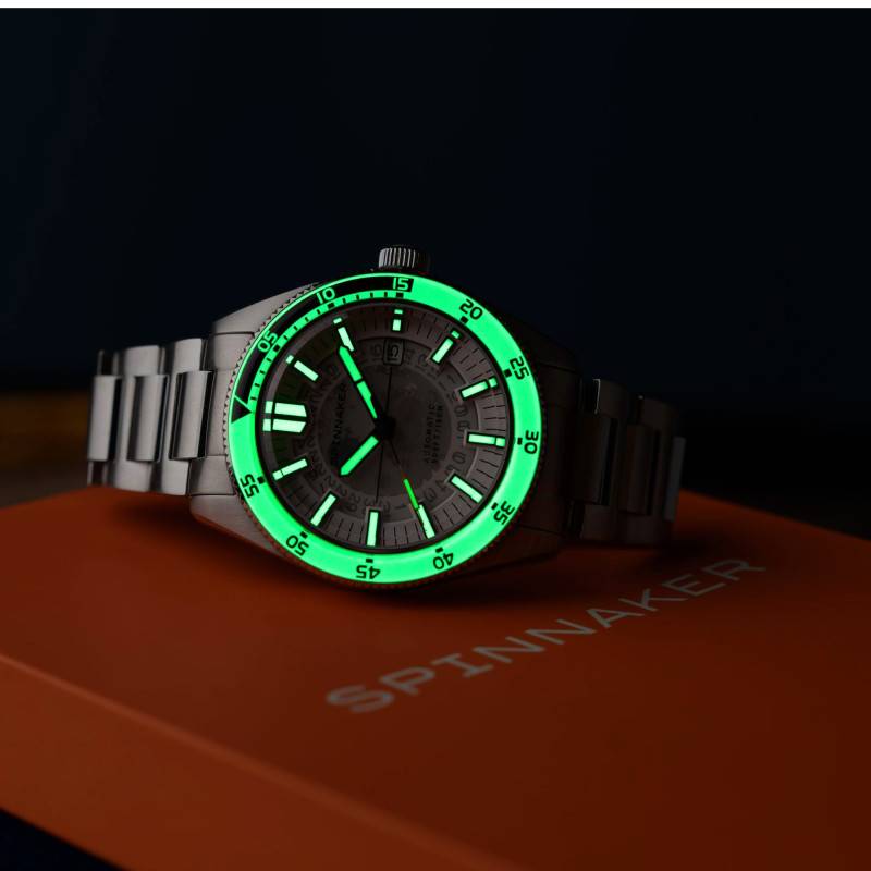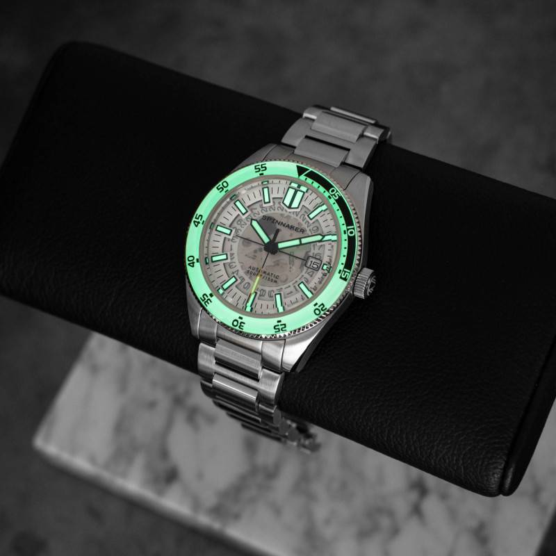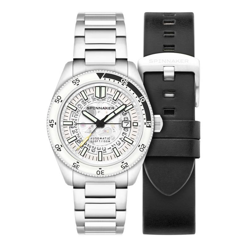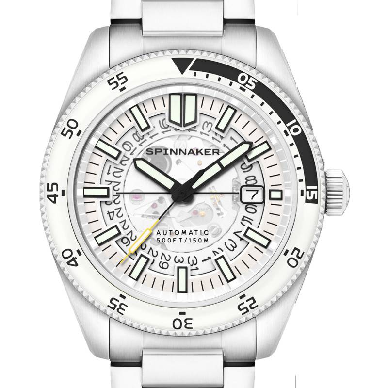 Le cadran de cette montre se démarque par sa finition cœur ouvert qui permet de laisser entrevoir le cœur battant du mouvement mécanique, une caractéristique qui ravira les amateurs d'horlogerie. De couleur blanc éclatant, il affiche des index luminescents qui permettent une lecture claire de l'heure même dans l'obscurité. Le chemin de fer des minutes parcourt le bord extérieur du cadran, accentuant l'aspect fonctionnel de ce modèle. Les aiguilles sont également revêtues d'un traitement luminescent, garantissant une visibilité maximale de nuit comme de jour. Un guichet date discret vient se positionner à trois heures, complétant ainsi les indications de temps principales : heures, minutes et secondes. L'emblème de la marque Spinnaker est fièrement apposé sous le douze heures.