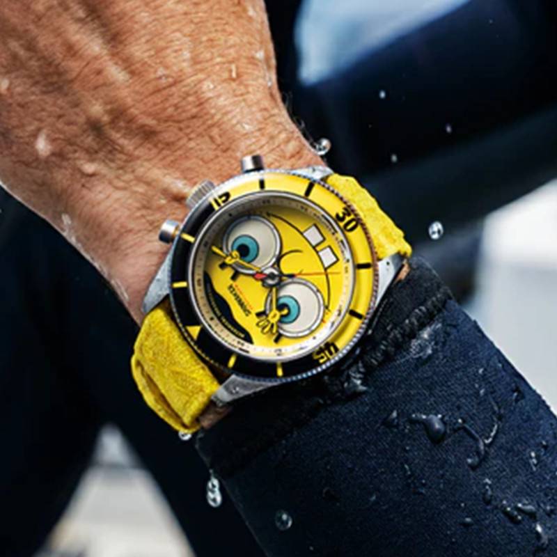 Le cadran de cette montre se distingue par son jaune éclatant associé au graphisme des yeux de Spongebob, offrant ainsi un design amusant et notable. Les chiffres arabes sont fins et parfaitement intégrés au design général, apportant une lisibilité immédiate. Les aiguilles SuperLuminova des heures, minutes et secondes se détachent élégamment sur le fond, permettant une lecture facile même dans des conditions de faible luminosité grâce au traitement antireflets sur le verre saphir. Deux compteurs additionnels sont ajoutés, petites secondes et 30 minutes, permettant une lecture précise de l'heure.
